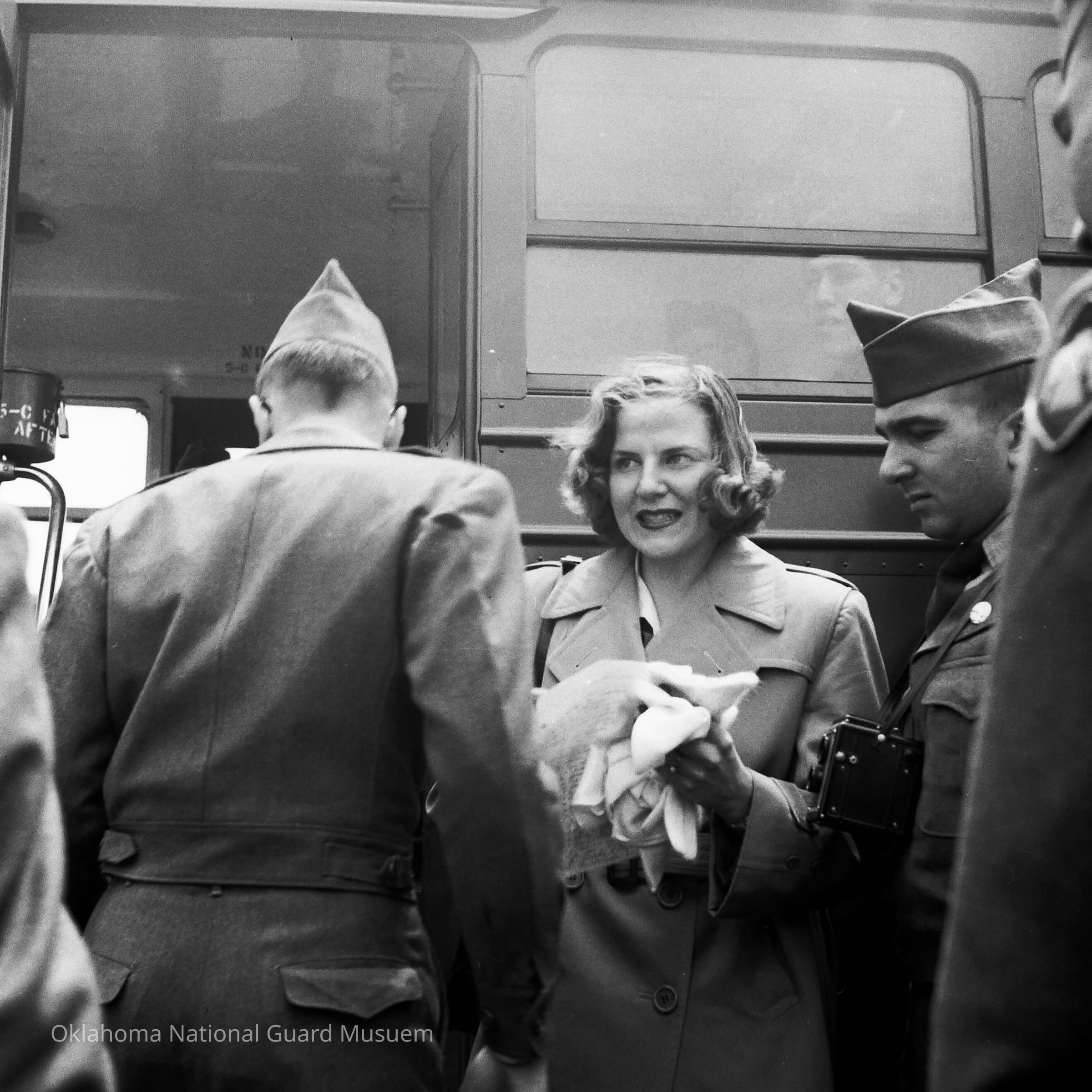 Negative of soldiers and woman boarding a bus
