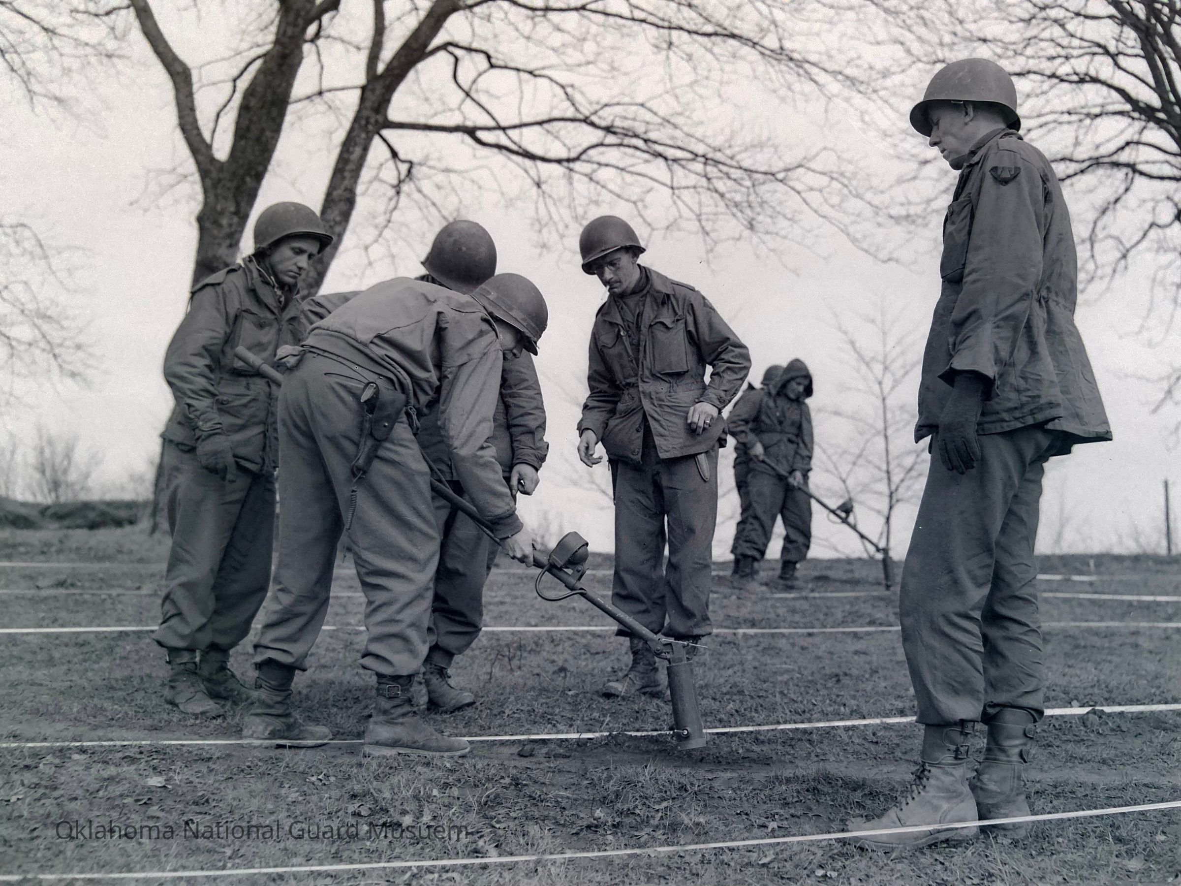 Negative of soldiers at mine search school. 120th Engineers