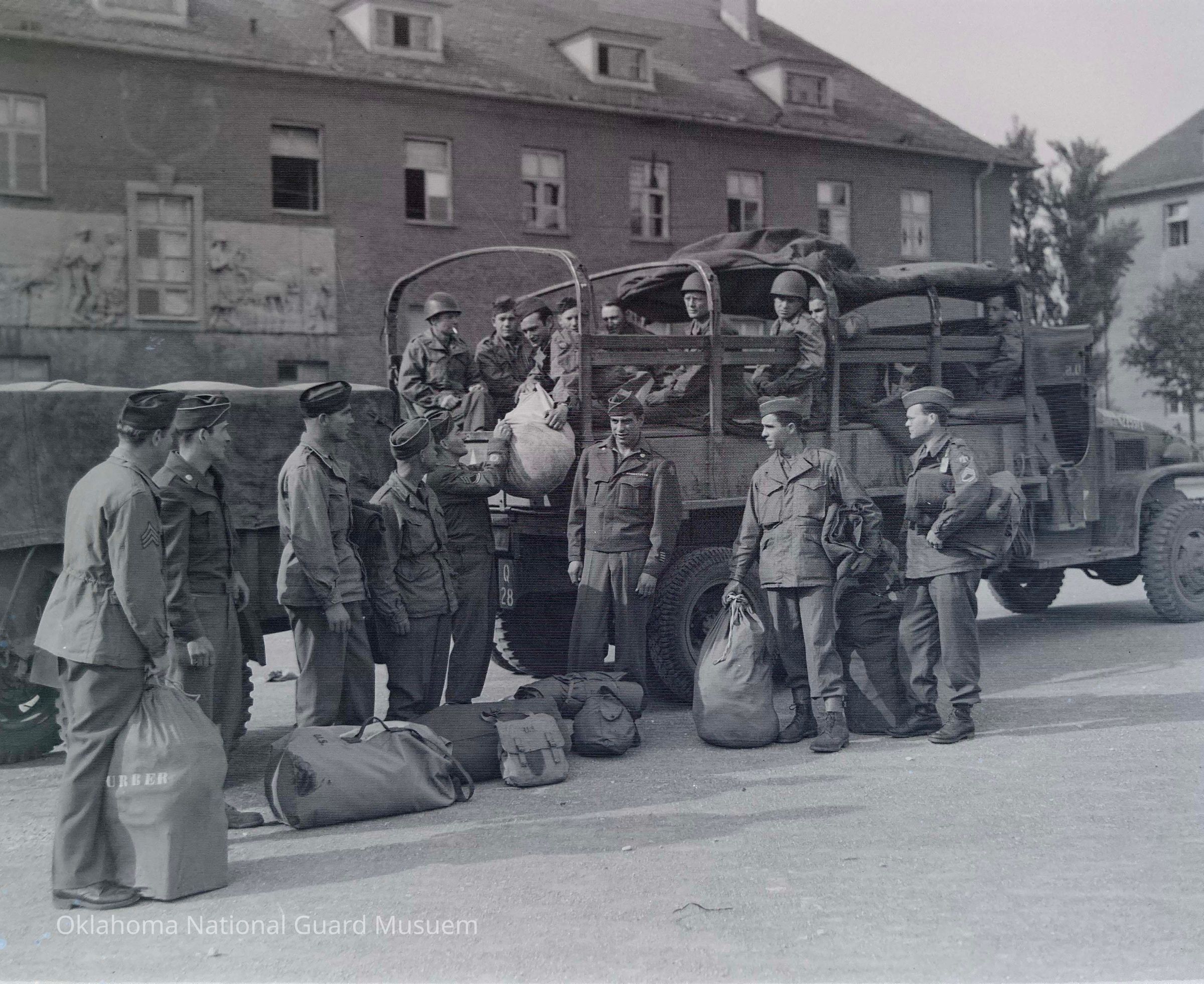 Negative of soldiers boarding transport truck