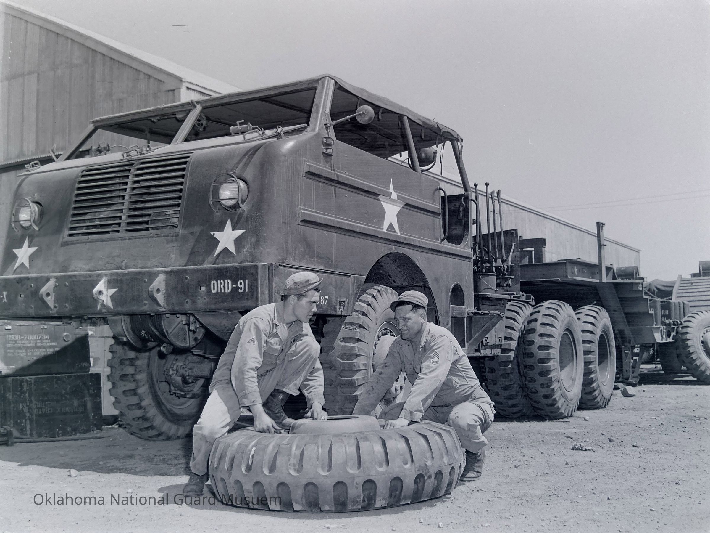 Soldiers changing tire on tank-hauling tractor