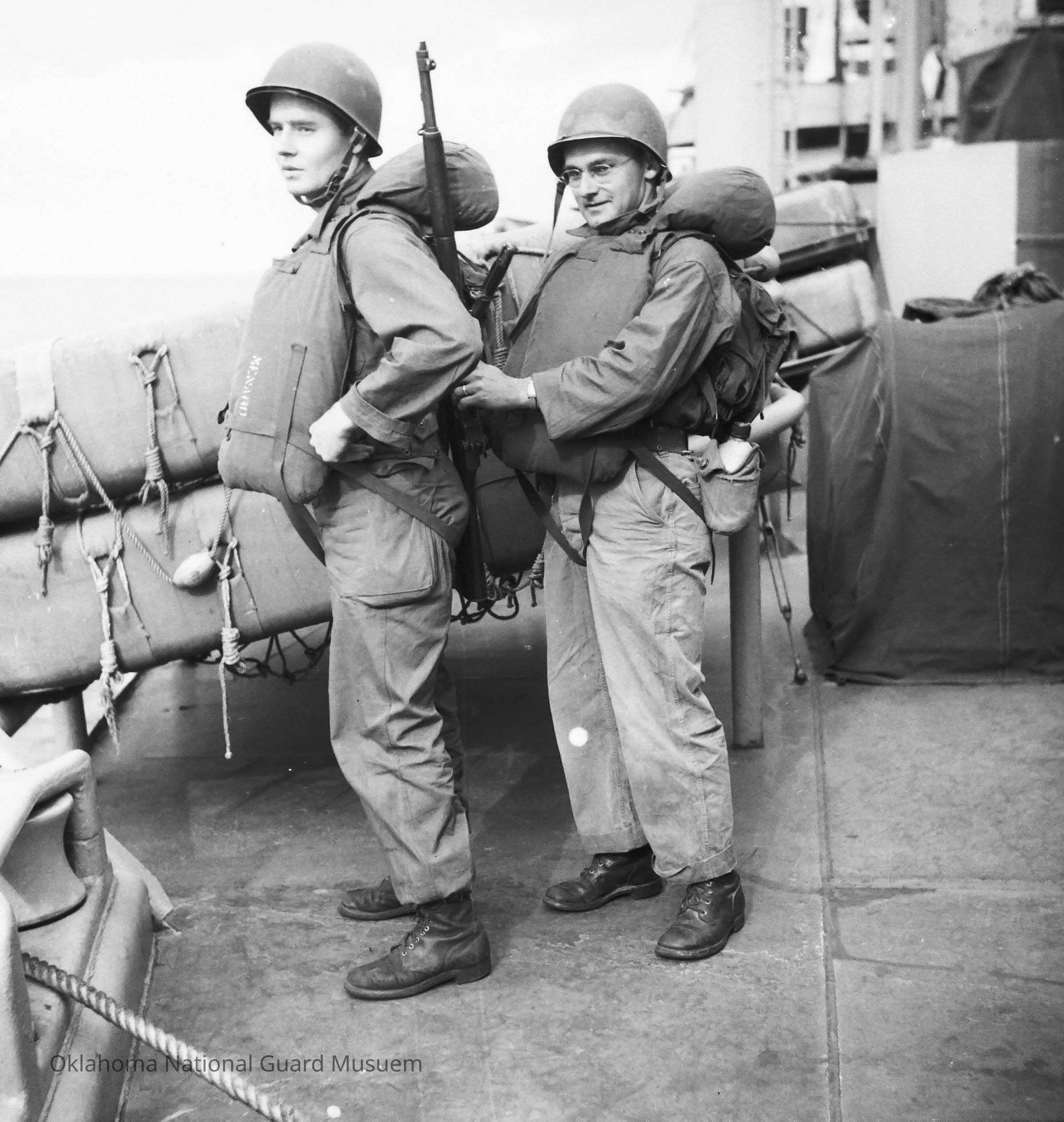Negative of soldiers checking each other's life vests