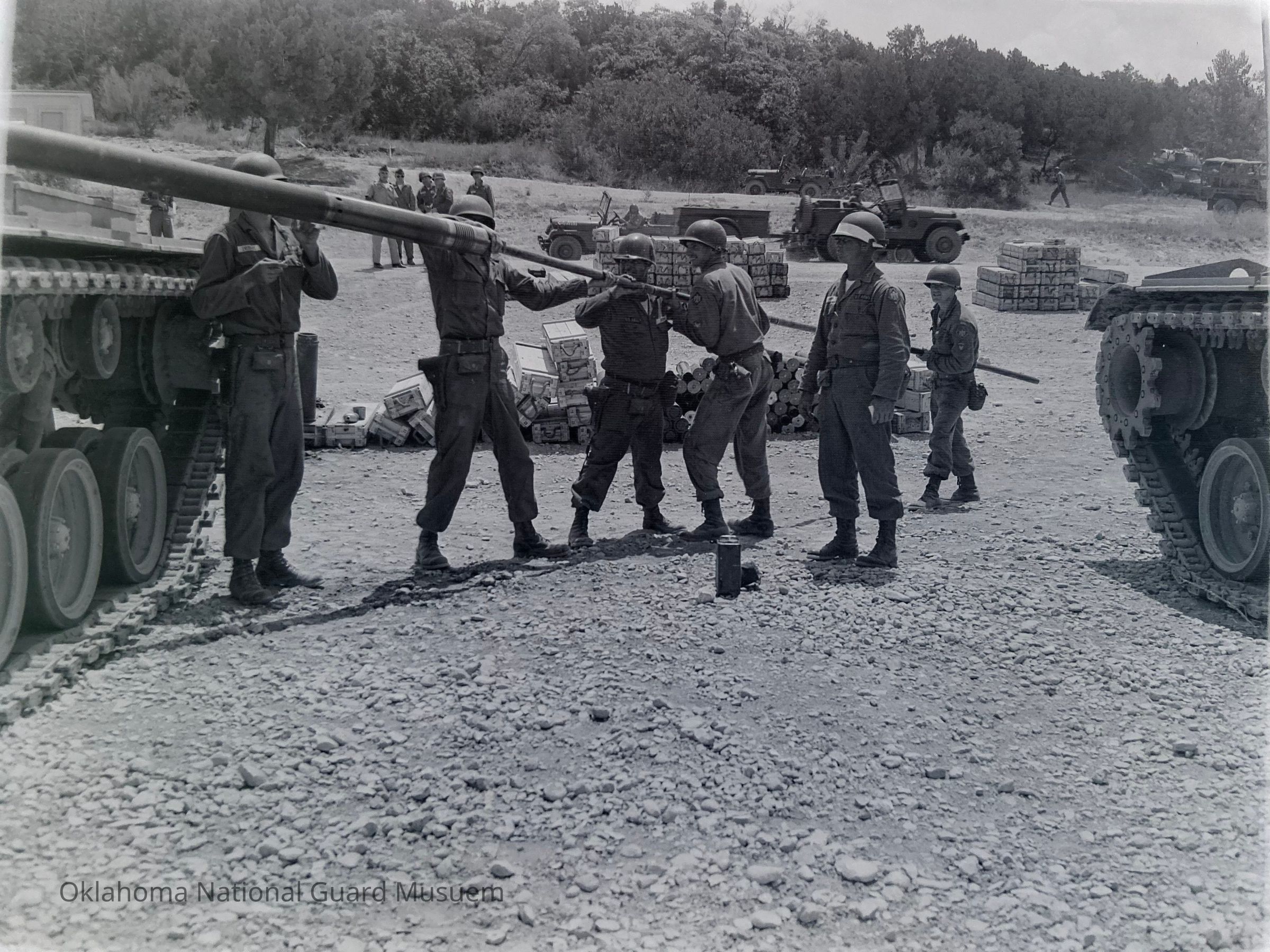 Negative of soldiers cleaning the main tube on a tank. 245th Tank Battalion