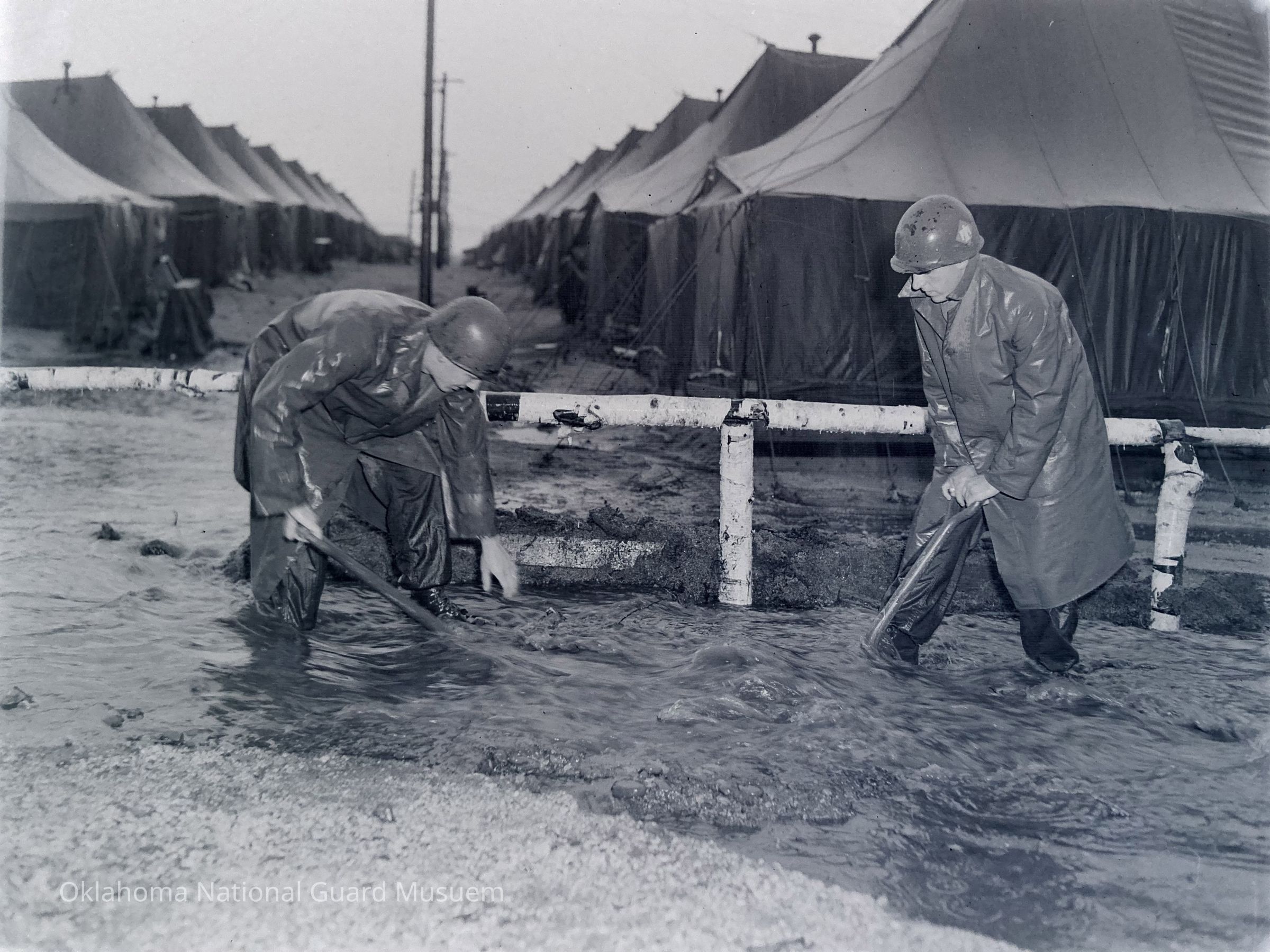 Negative of soldiers clearing debris in a flooded camp area on Hokkaido, Japan