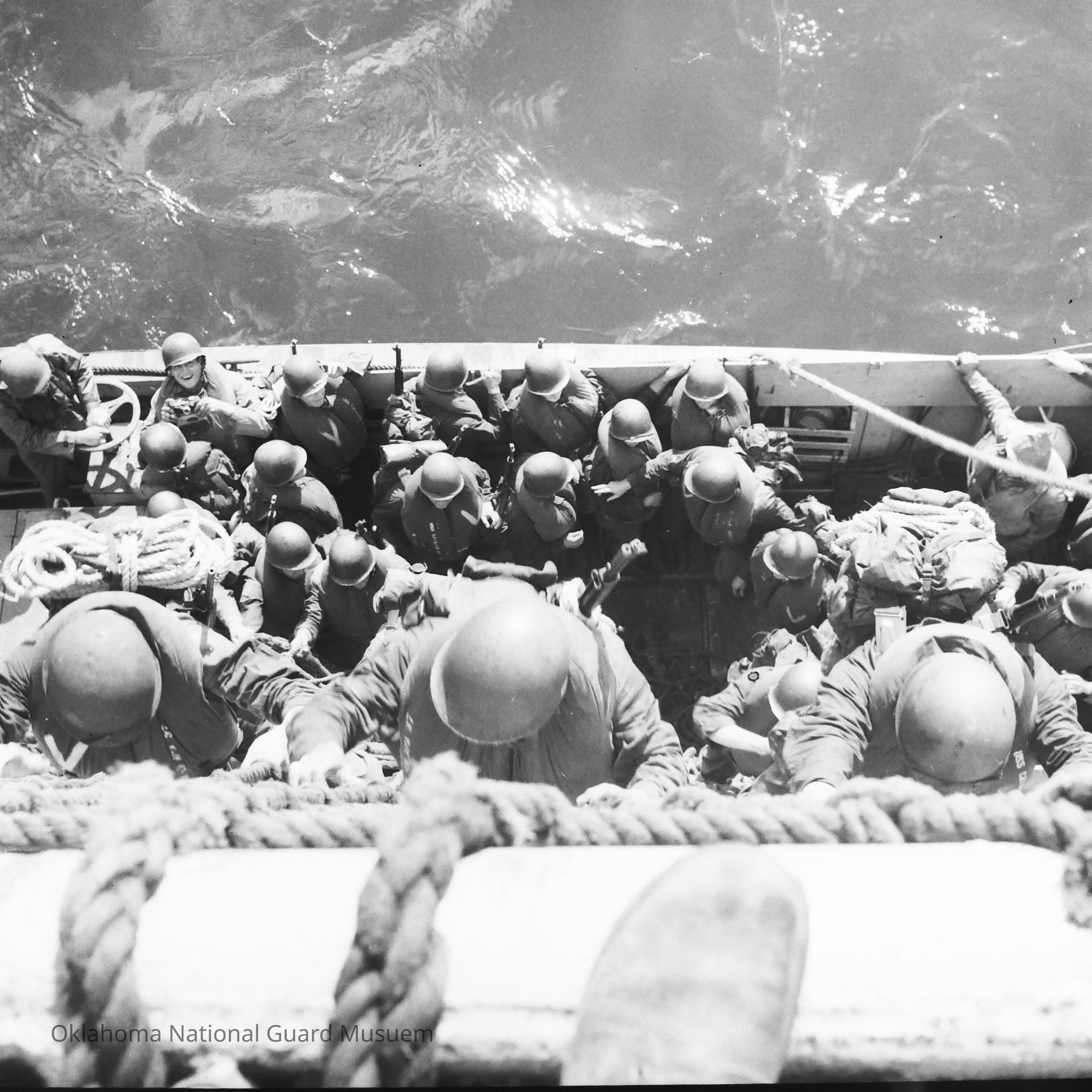 Negative of soldiers climbing down nets into landing craft