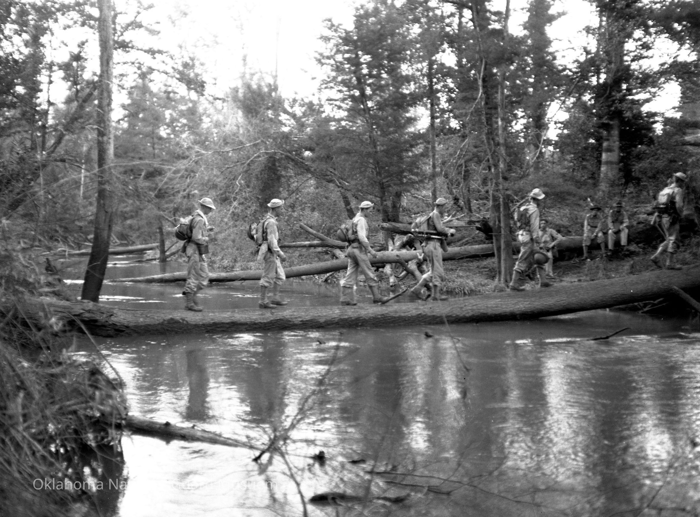 Soldiers crossing a stream on a fallen tree