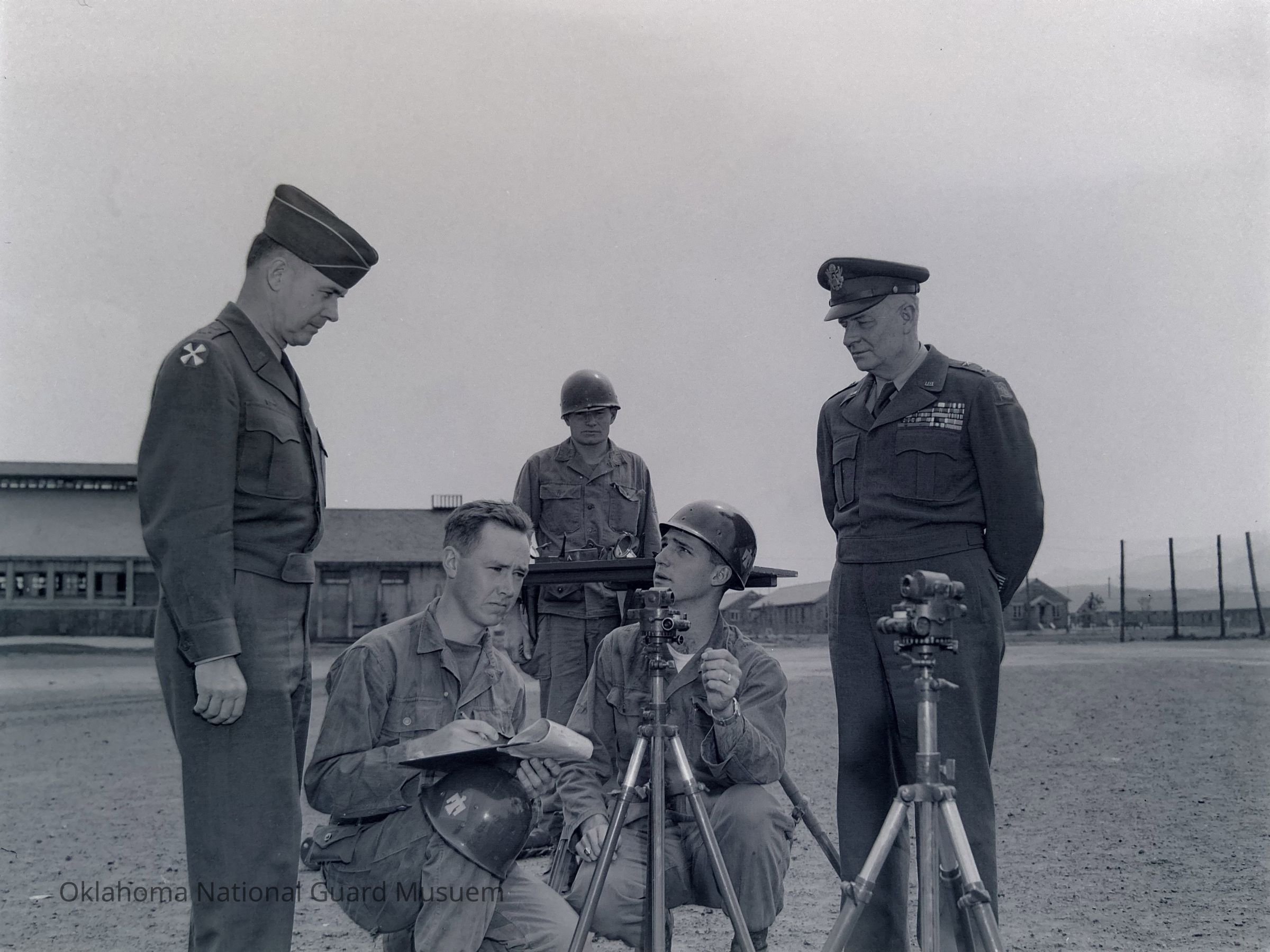 Negative of soldiers demonstrating equipment to Major General Roderick Allen on Hokkaido, Japan