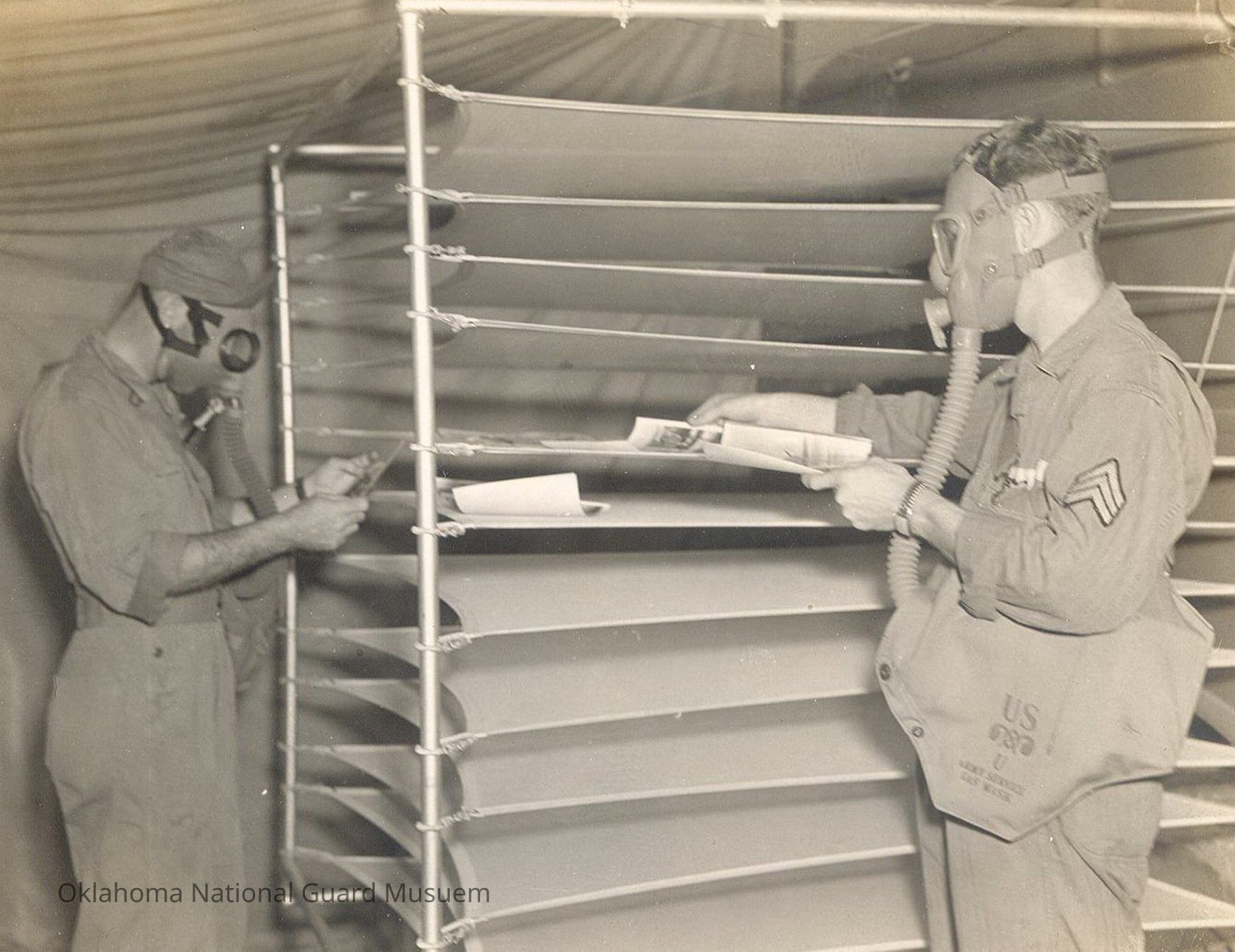 Soldiers of the 125th Observation Squadron developing photos while wearing gas masks