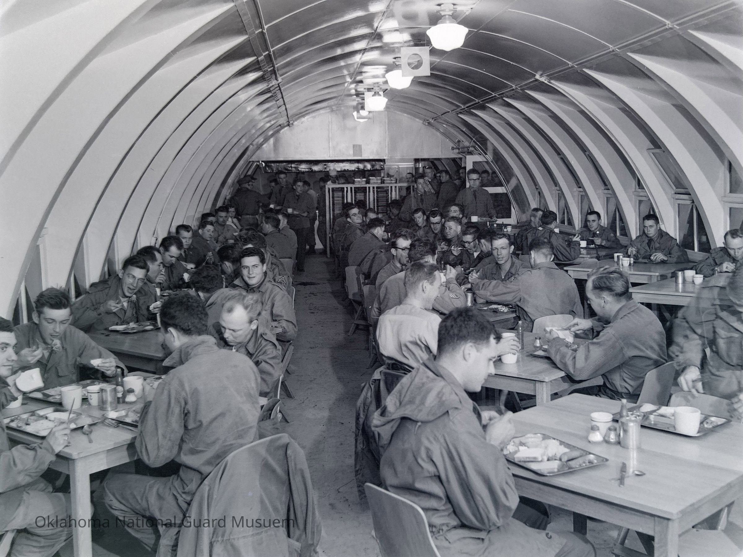 Soldiers, Quonset huts, Mess halls, Dining, Eating & drinking, Eating & drinking facilities, Tables, Food