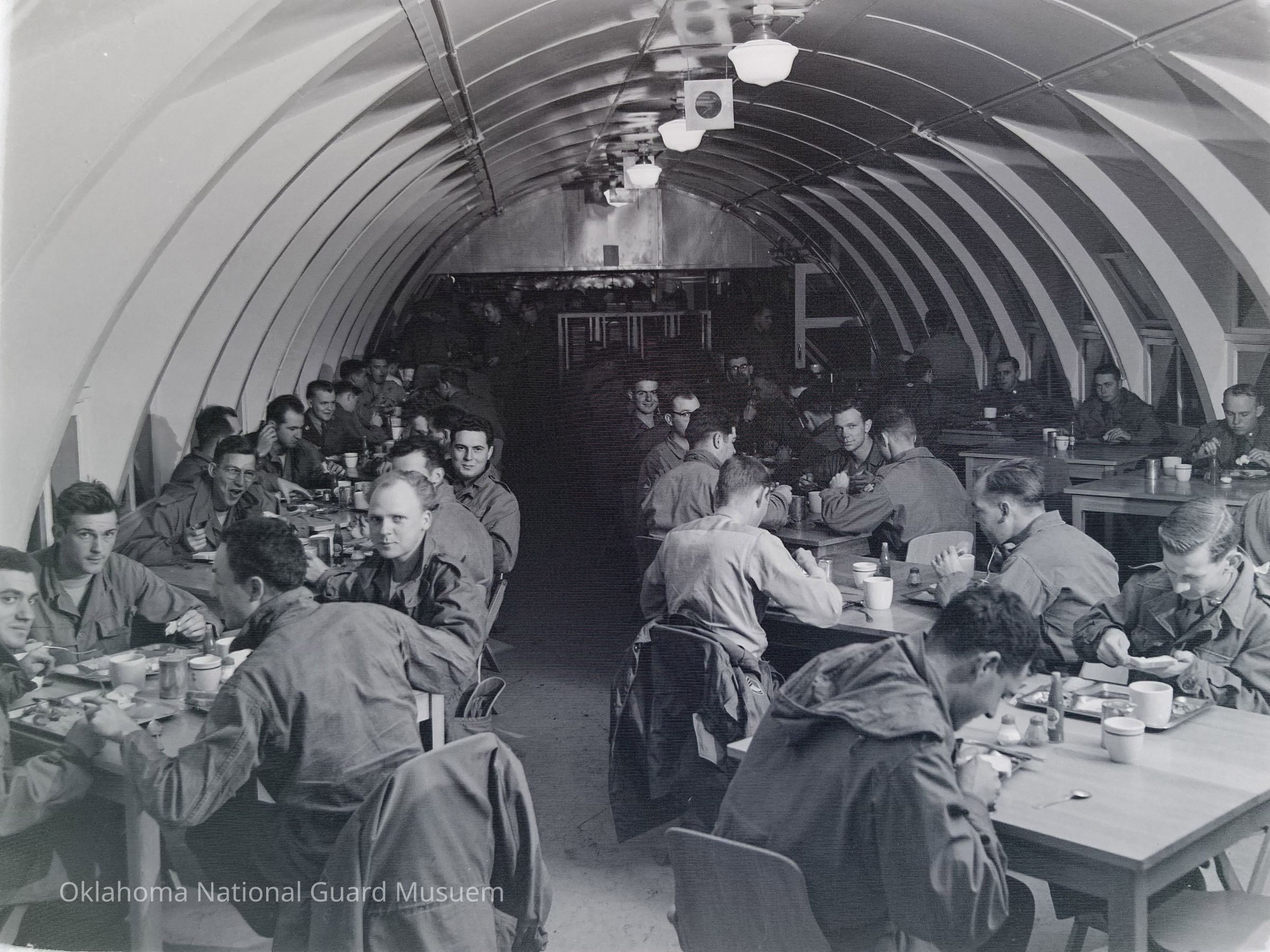 Soldiers, Quonset huts, Mess halls, Dining, Eating & drinking, Eating & drinking facilities, Tables, Food