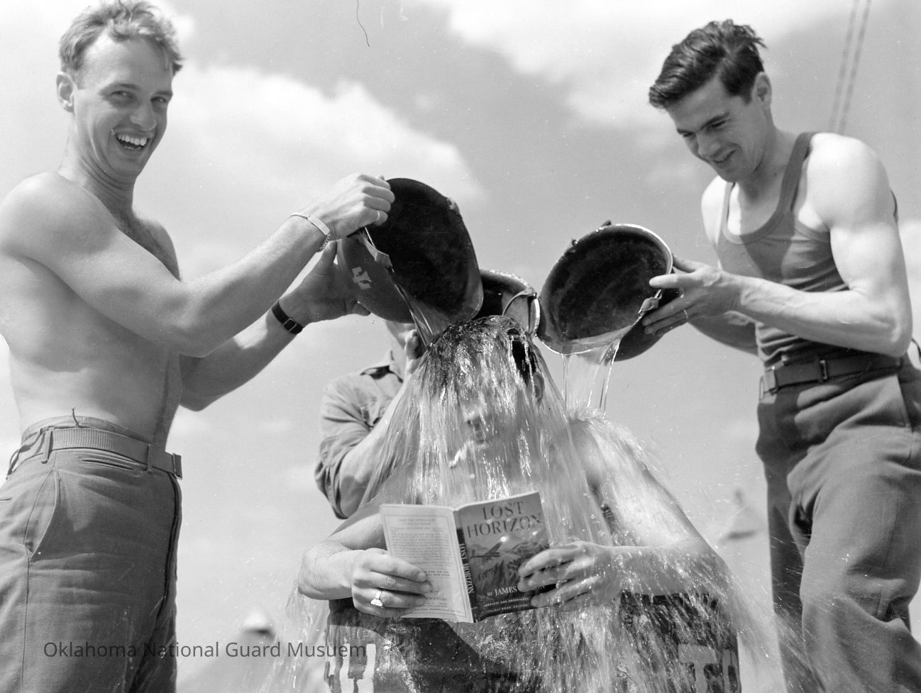 Soldiers dumping water on friend