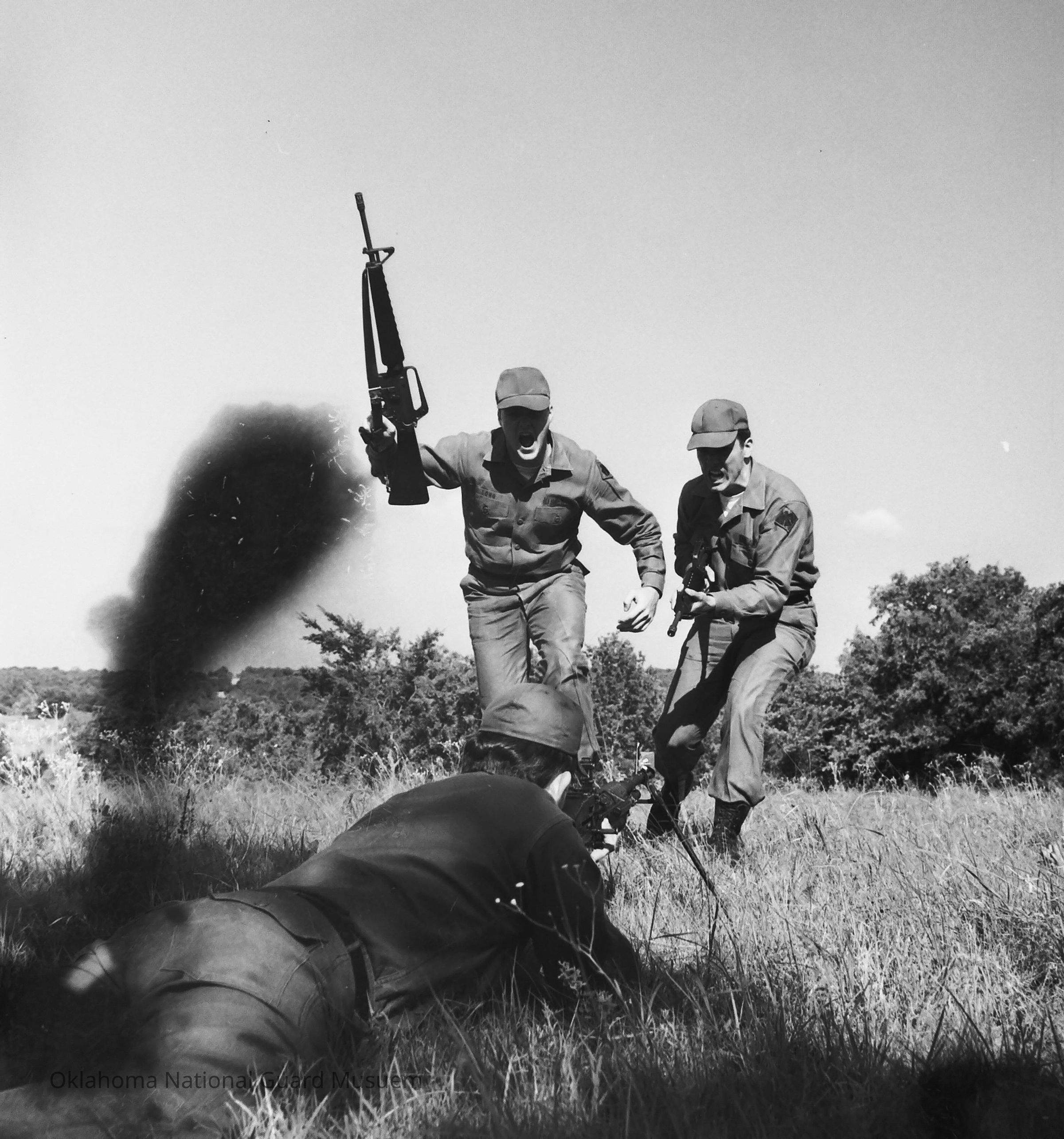 Negative of soldiers enacting an infantry attack