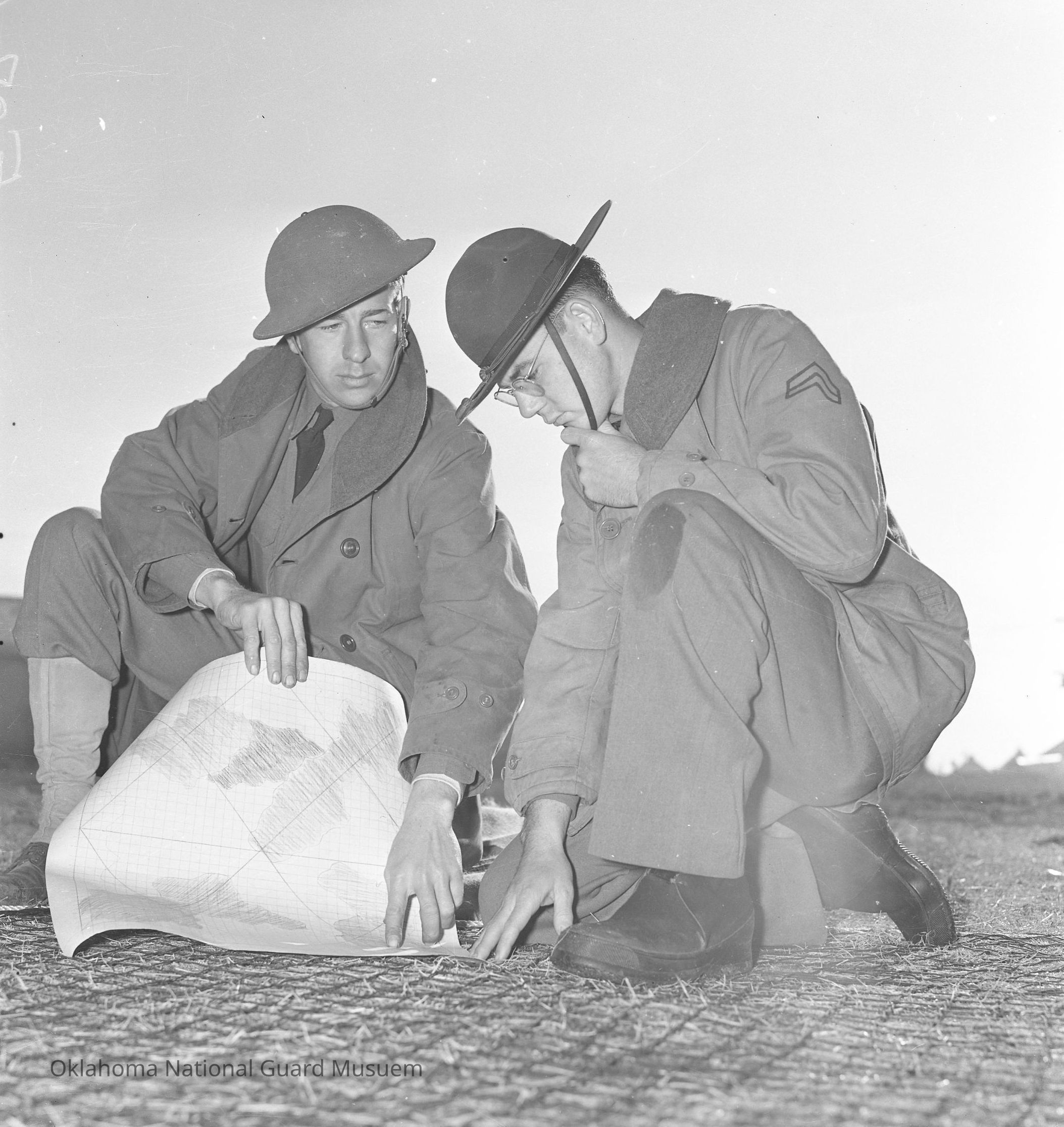 Negative of soldiers examining a map