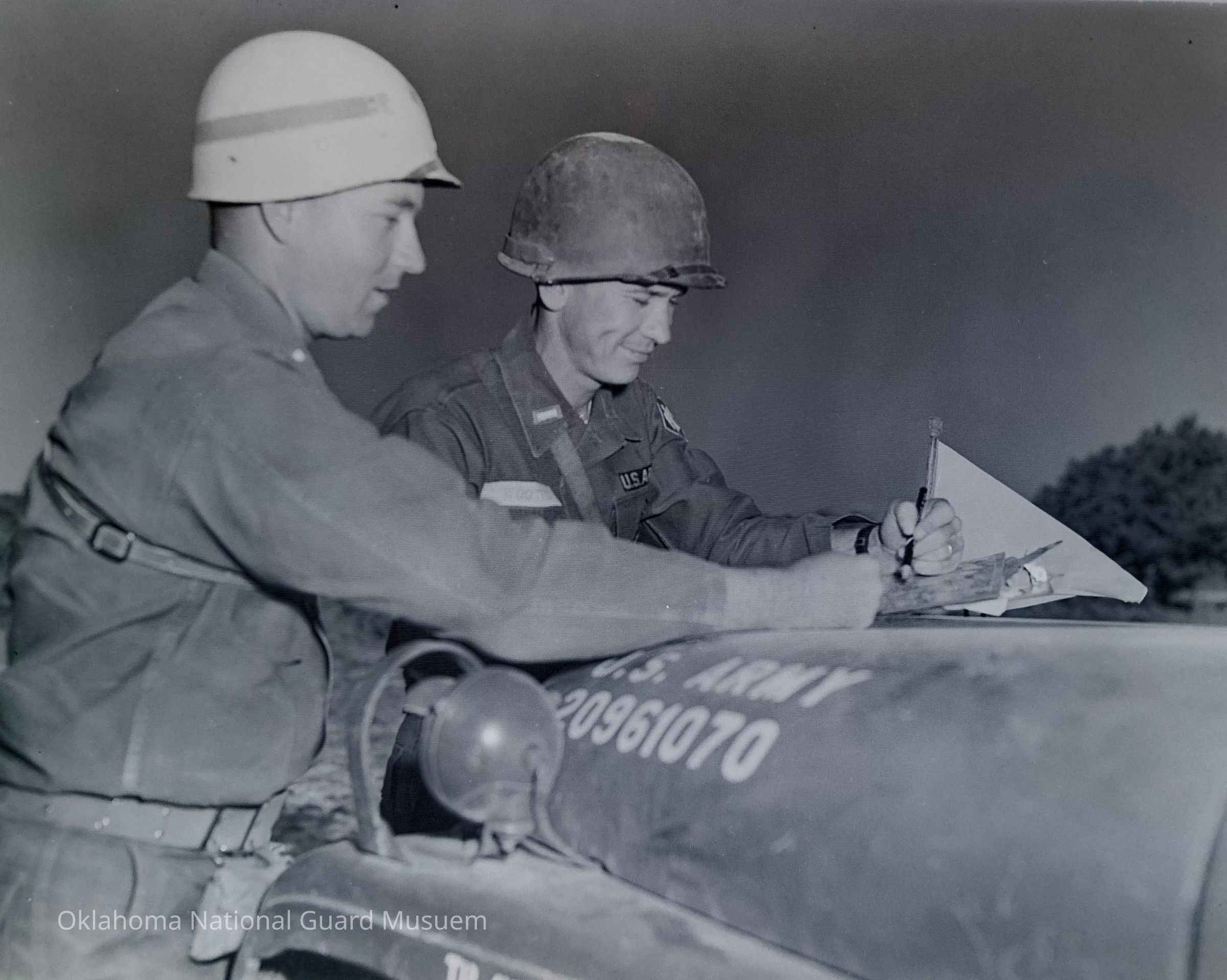Negative of Soldiers examining a map on the hood of a jeep. 245th Tank Battalion