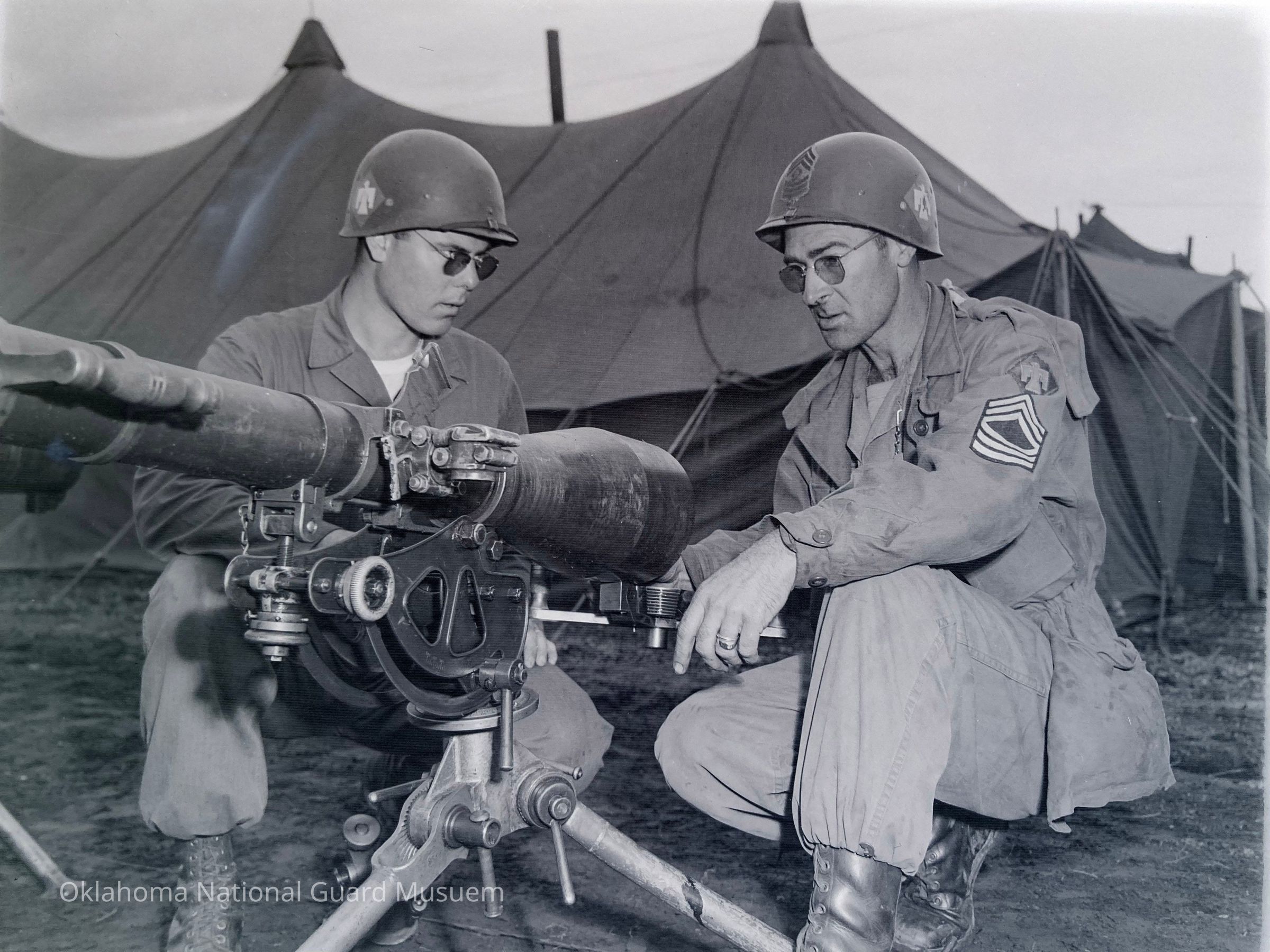 Soldiers examining a recoilless rifle with tent camp in background