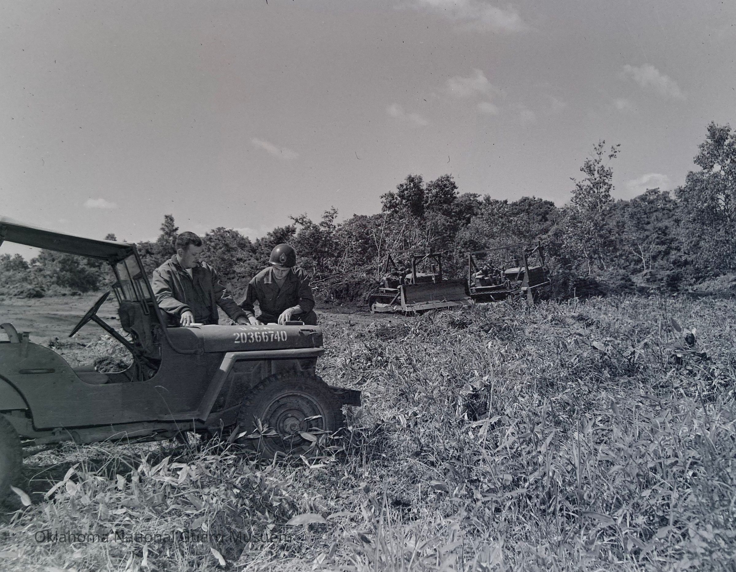 Negative of soldiers examining plans on the hood of a jeep with bulldozers in the background