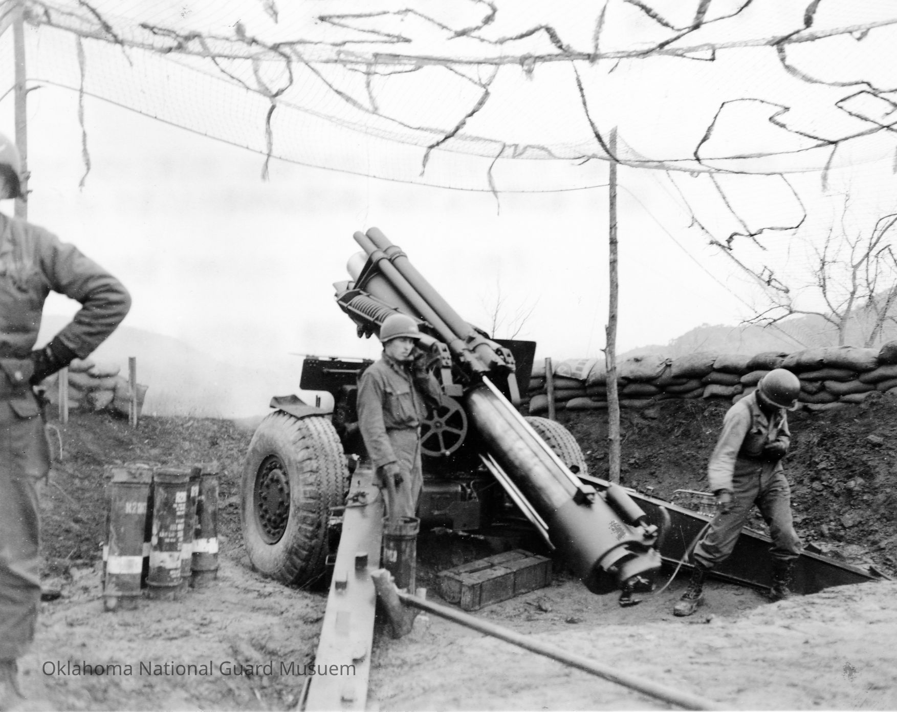 Soldiers Harvy Clinton (left) and Don Holland (right) of Battery C 189th Field Artillery firing 155mm howitzer. Both are from Ponca City, Oklahoma