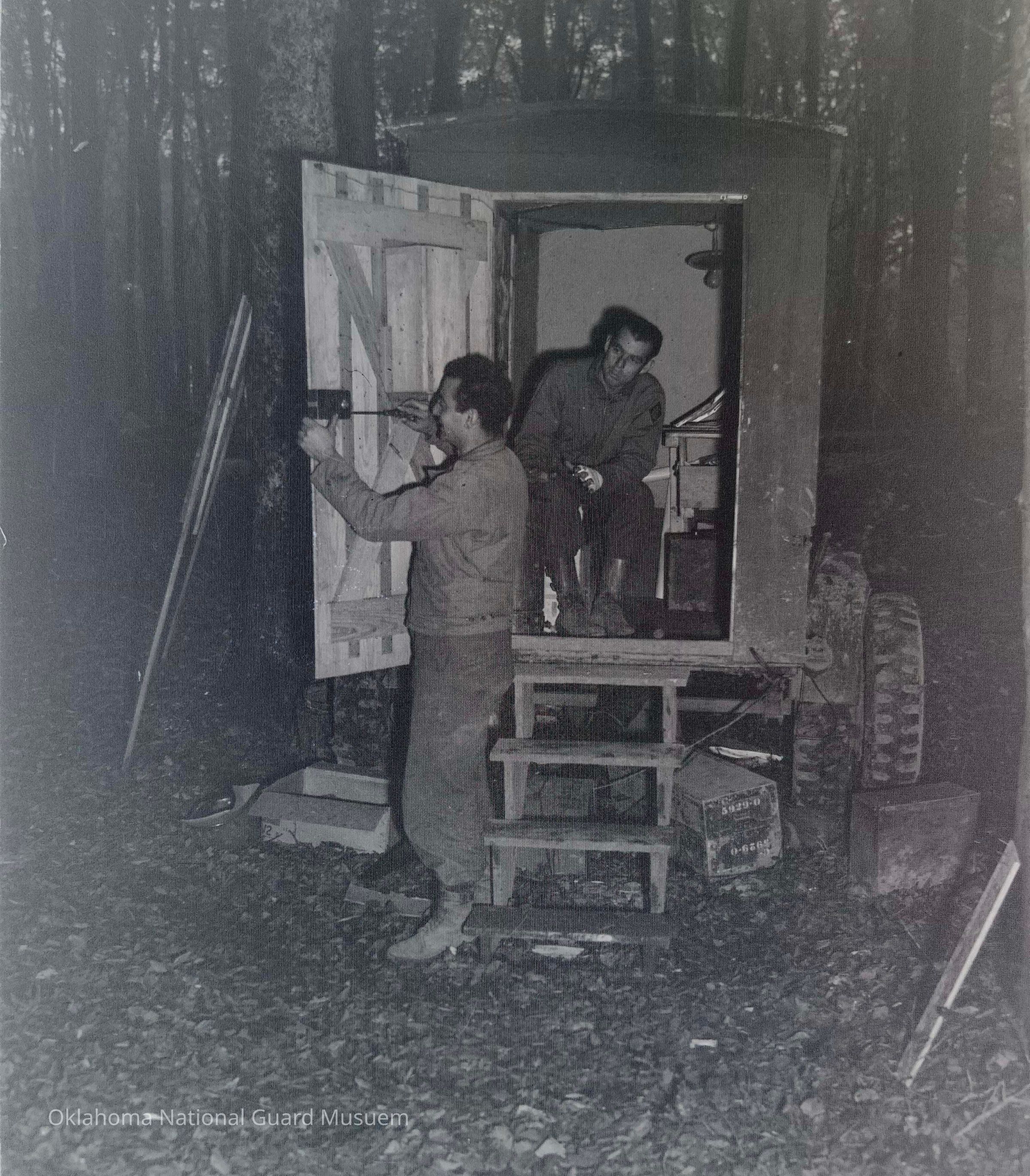 Negative of soldiers fixing a door on truck trailer