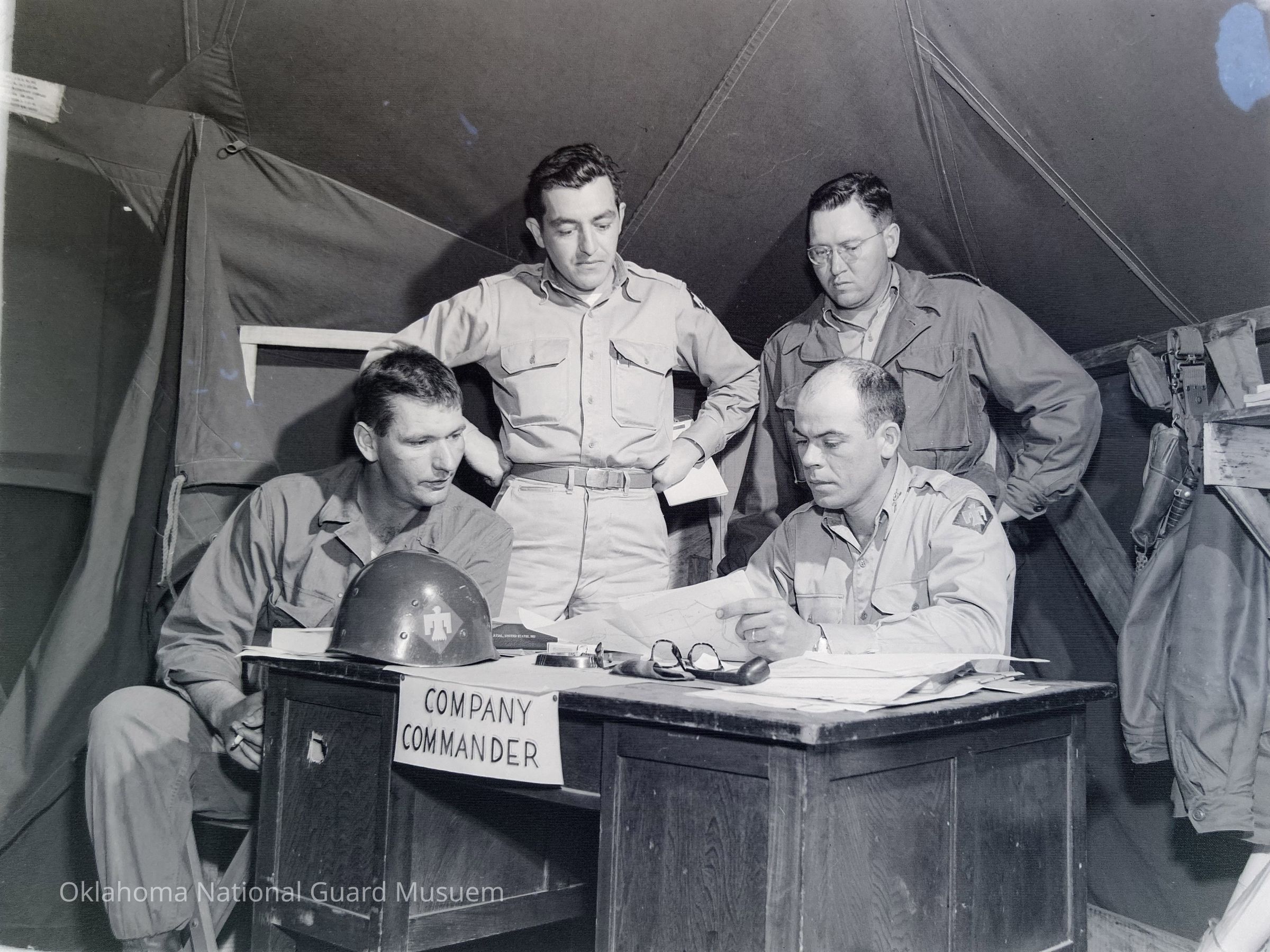 Soldiers gathered around the Company Commander at his desk in a tent