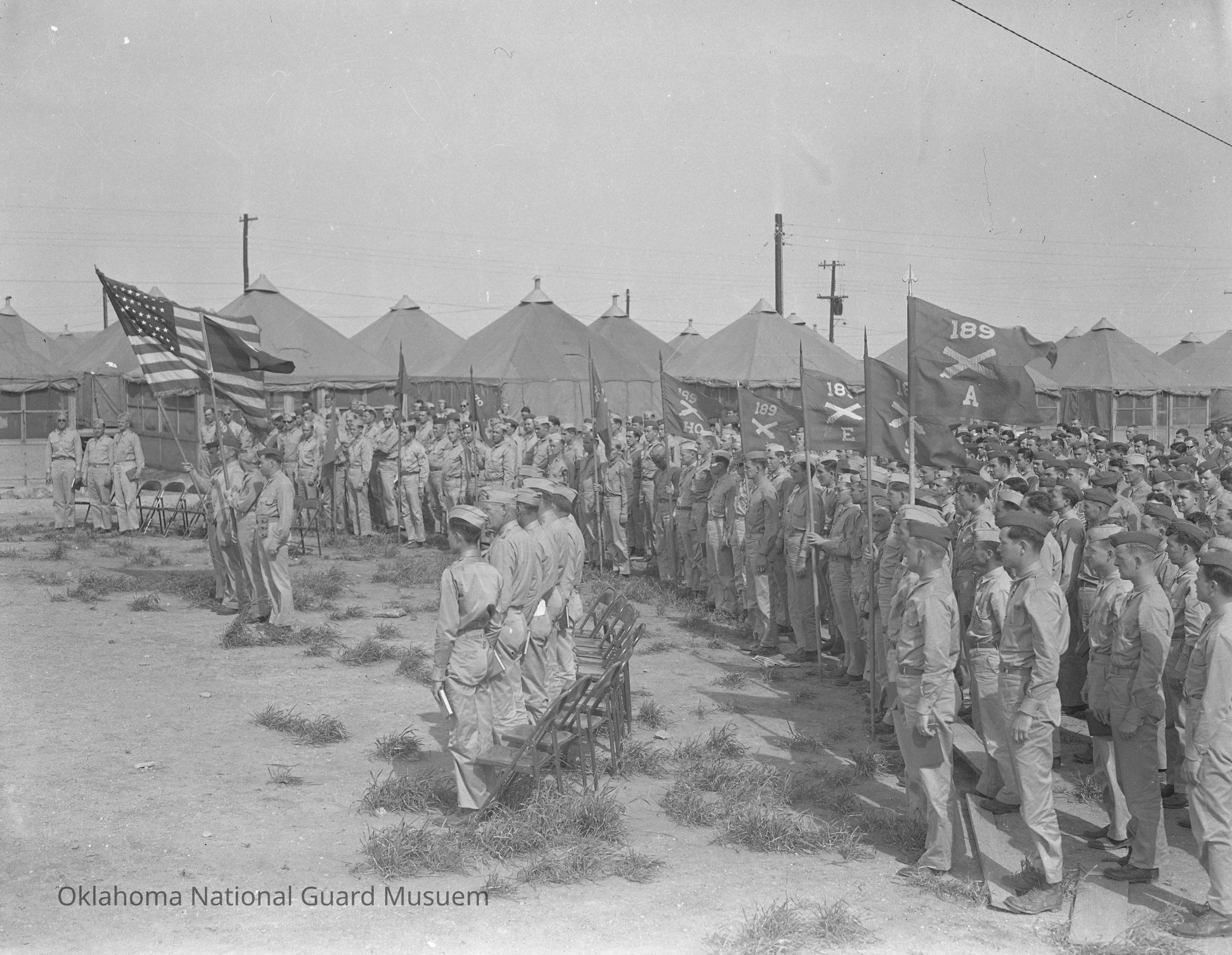 Negative of soldiers of the 189th Field Artillery gathered for ceremony