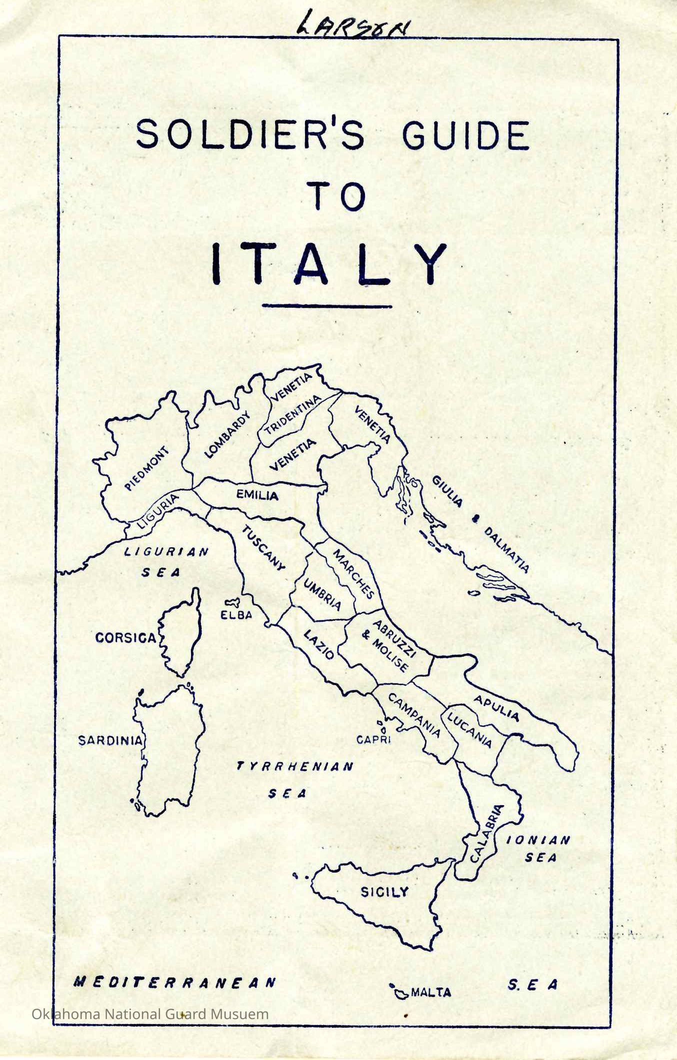 Solider guide given to 45th Division soldiers prior to the invasion of Italy. The guide covers language and key phrases, major geographic features, customs, and general population information of ItalyContext