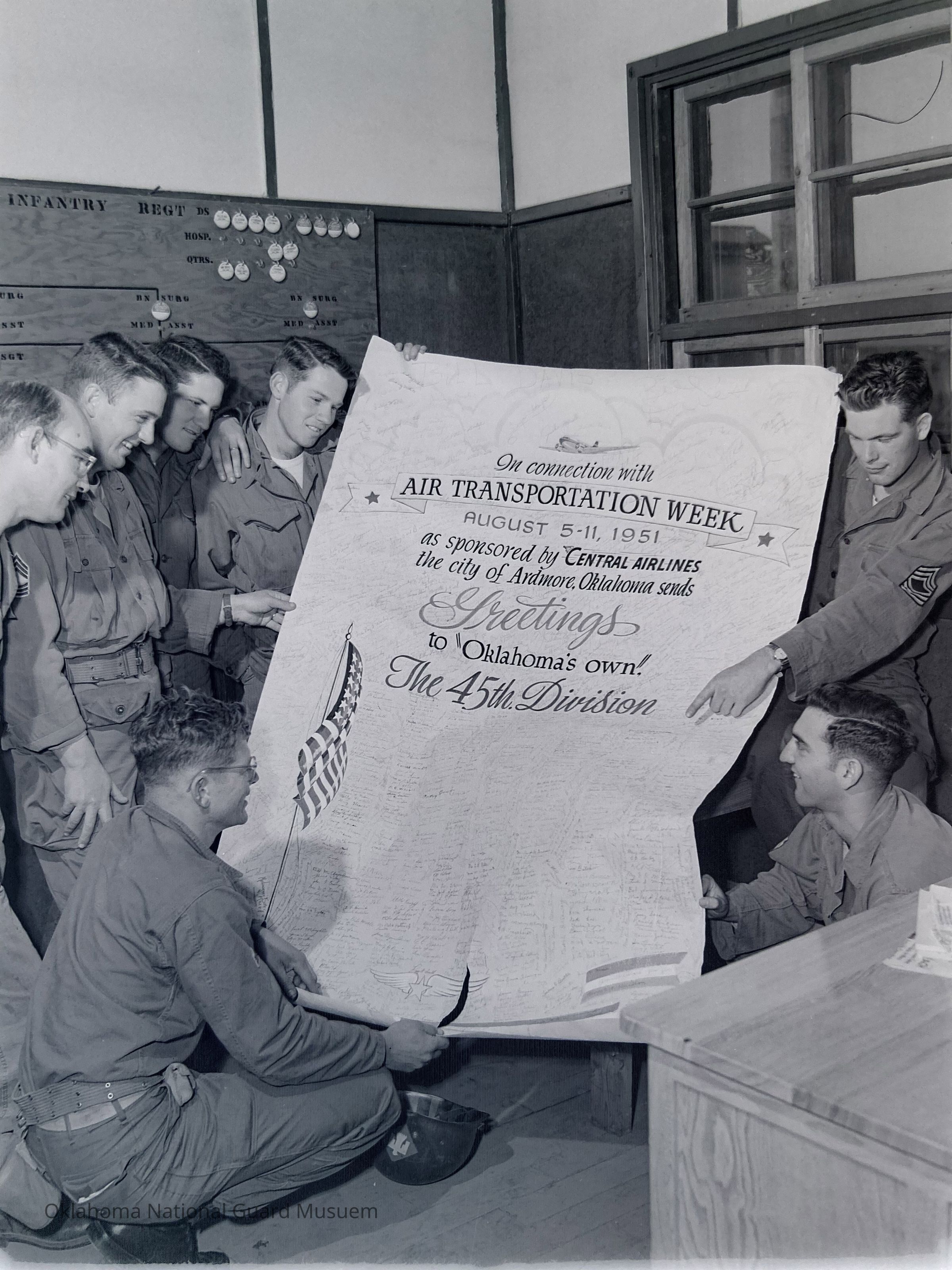 Soldiers holding poster celebrating "Air Transportation Week" sponsored by Central Airlines