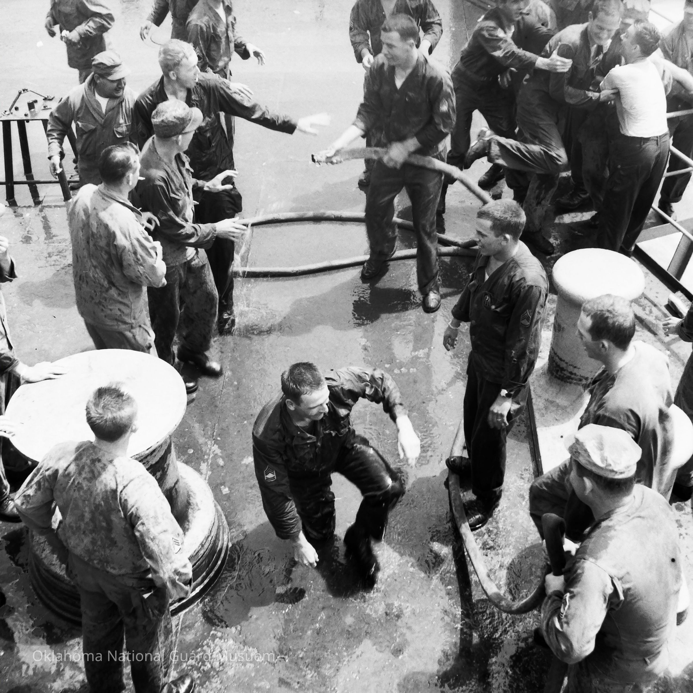 Soldiers hosing each other down onboard ship