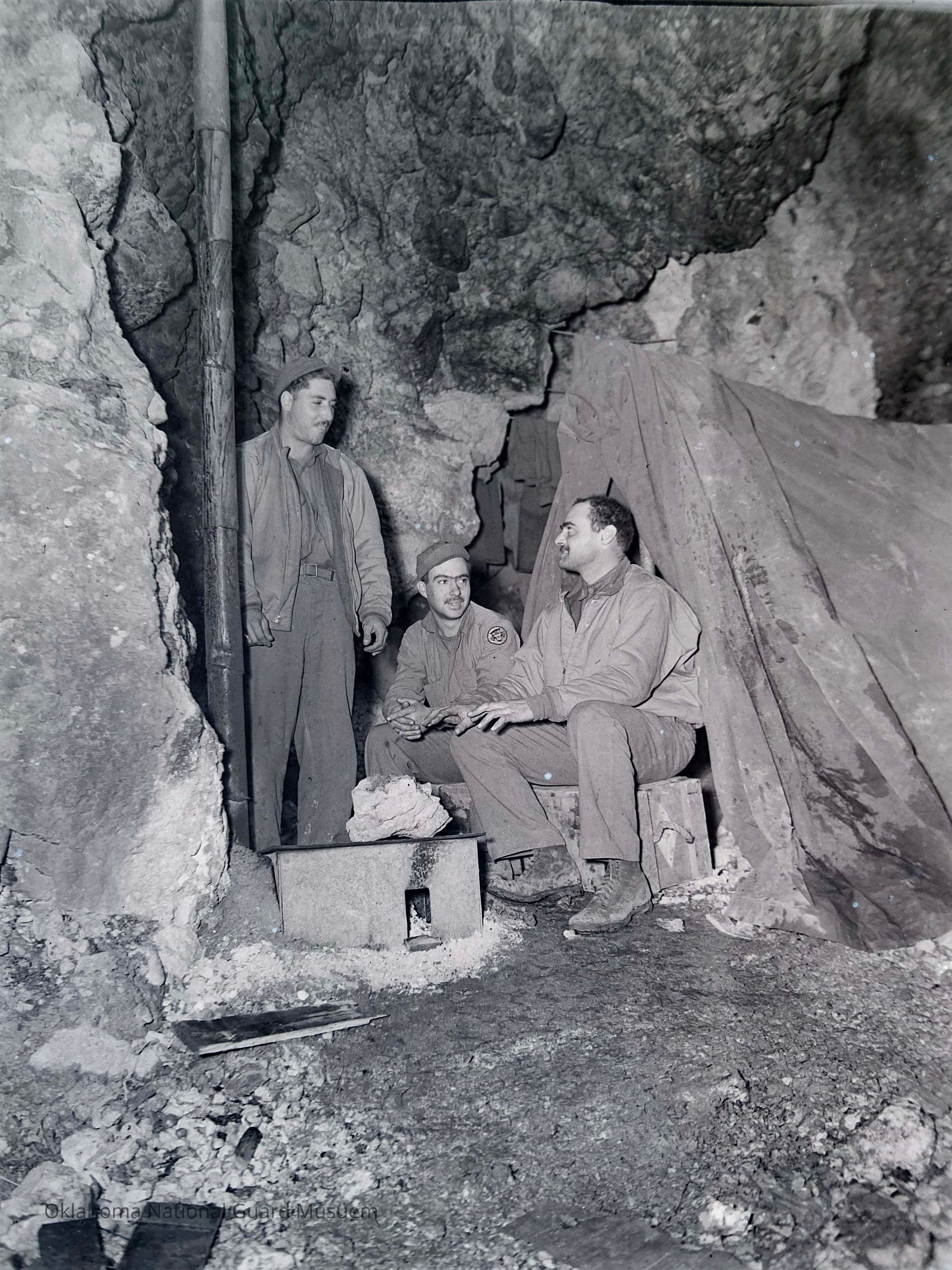 Photograph published in the 45th Division News, 11 December 1943, Vol. IV, No. 22, Caption "Home is where you find it, and these TDs (645th Tank Destroyer Bn.) found it halfway up a mountain. It's not as fancy as it might be but has all the necessities - a niche for hanging up laundry, a stove for cooking and heating, and a place to bunk. Left to Right, Pvt. Anthony Iozzo, Johnsburg, PA; Pvt. Floyd Mathews, Hazleton, WV; and Pfc. Harold Feurstein, Cleveland, OH, are enjoying the comforts of the cliff dwelling."Made/Created