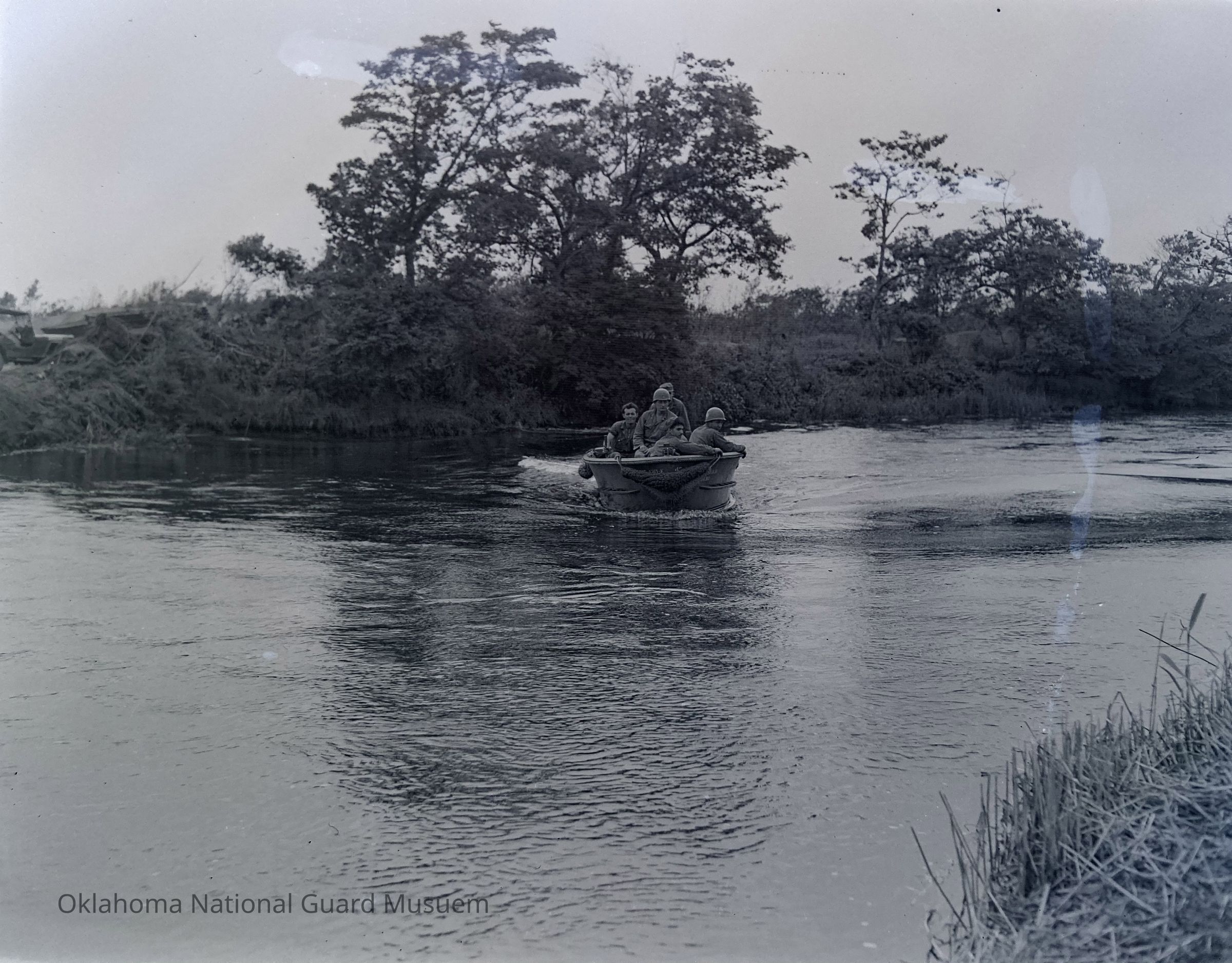 Soldiers in a motorboat on a river
