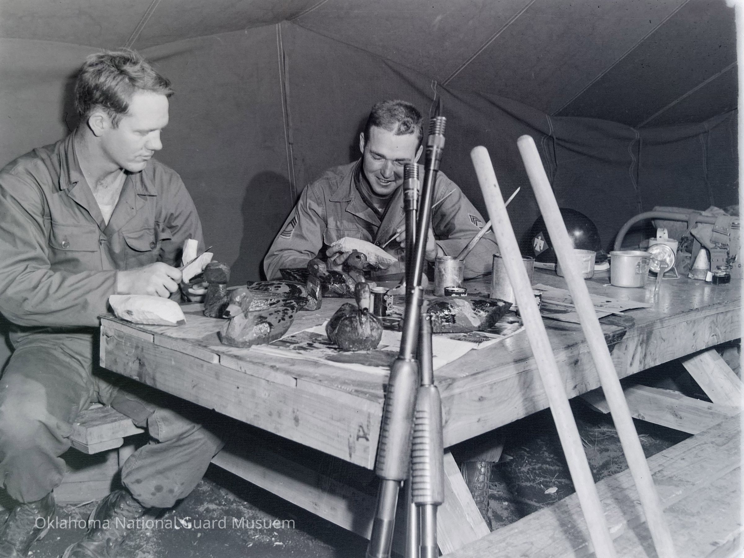 Soldiers in a tent making duck decoys