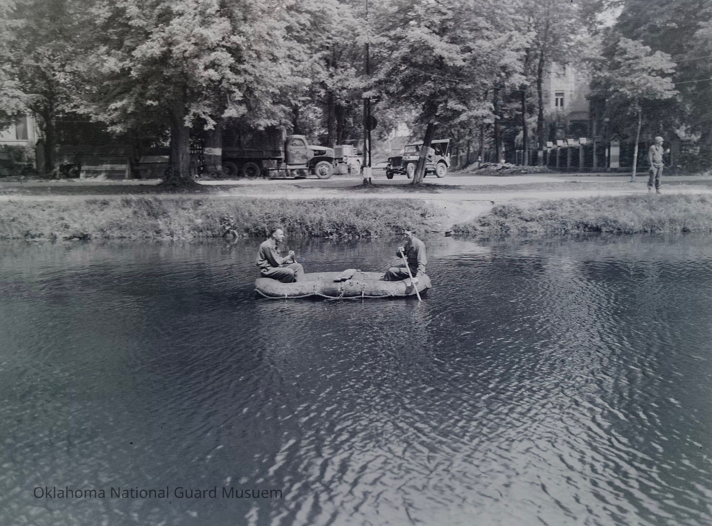 Negative of Frank Shartz (left) and Harold Van Nest (right) of the 45th Signal Corps float in an inflatable raft to celebrate the end of World War Two. Shartz is from Cleveland, Ohio and Van Nest is from Toledo, Ohio