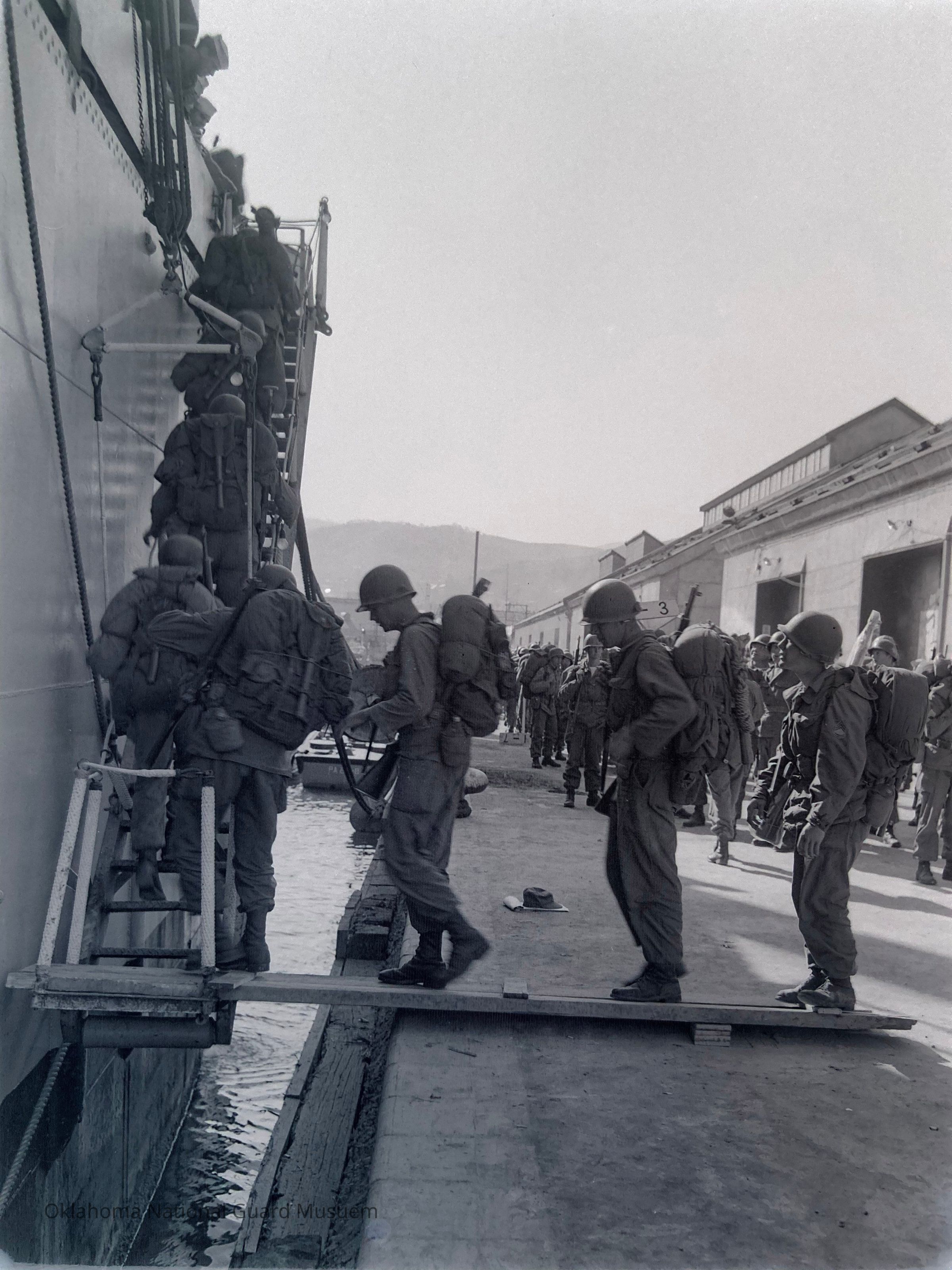 Negative of soldiers in field gear boarding a docked ship on Hokkaido, Japan