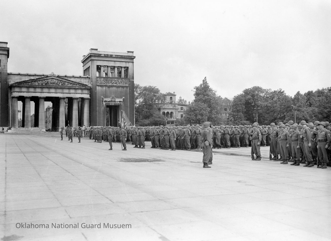 Soldiers of the 157th Infantry come to attention during the Memorial Day service