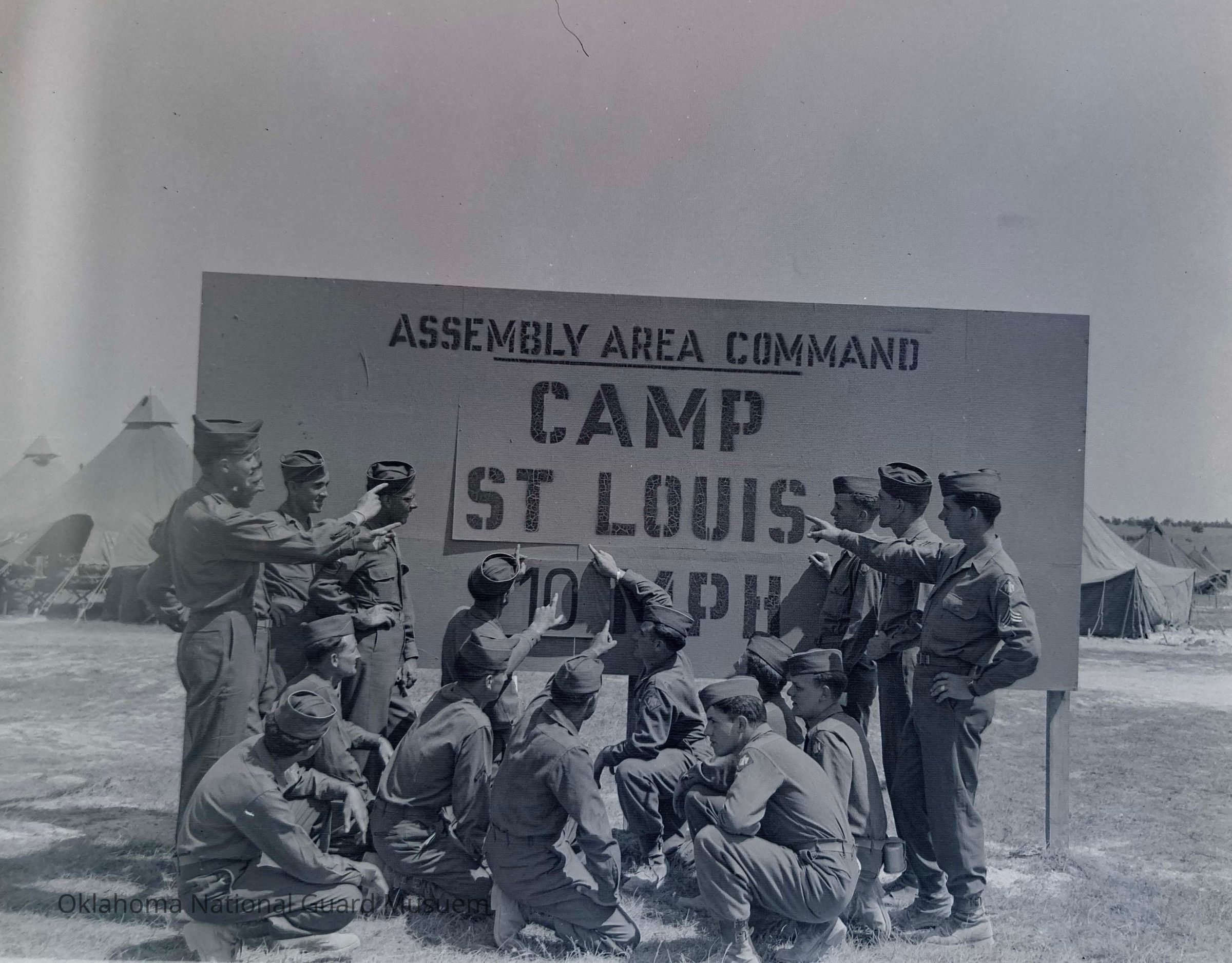 Soldiers in front of Camp St. Louis sign