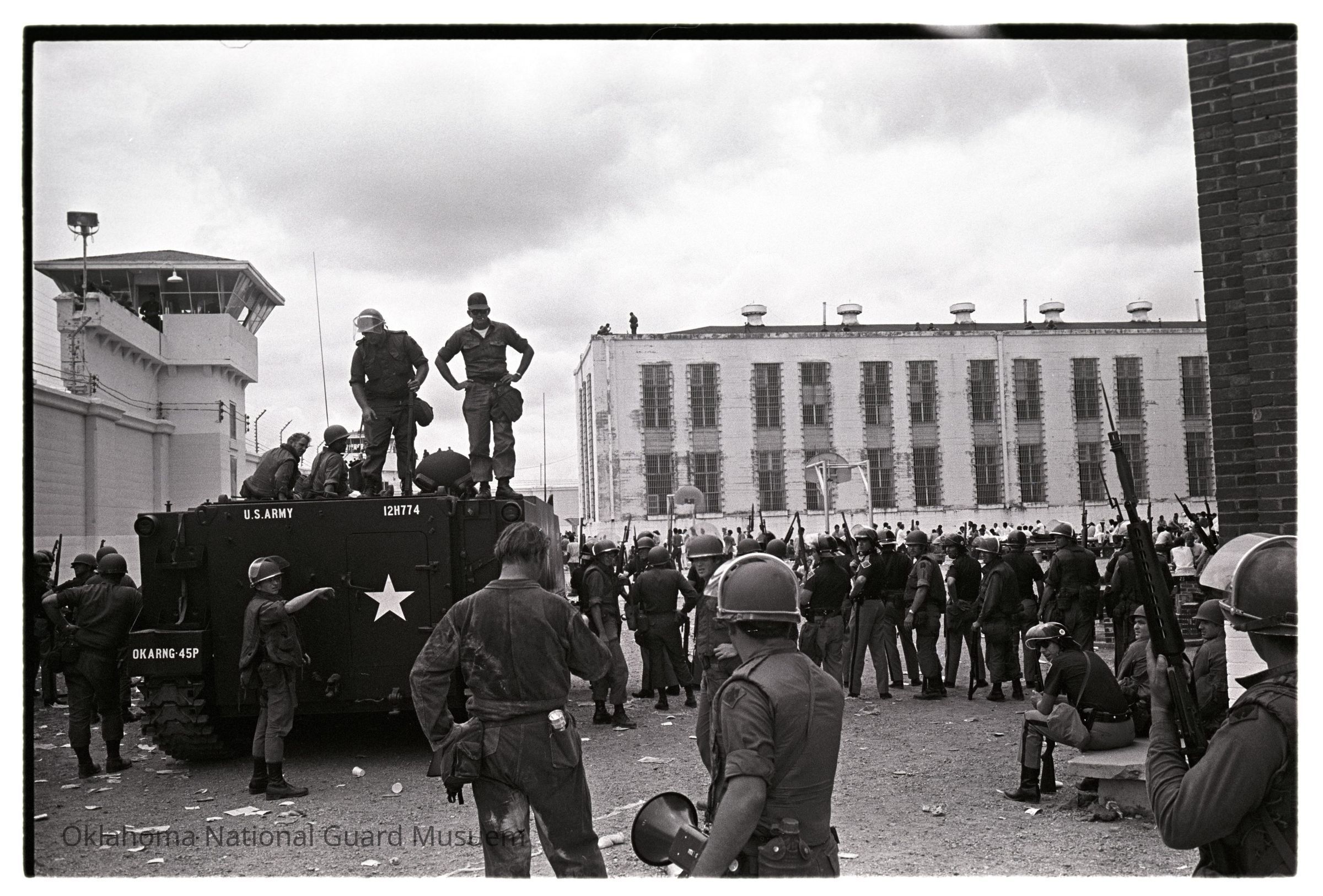 Soldiers in riot gear and an M113 during the McAlester Prision Riot