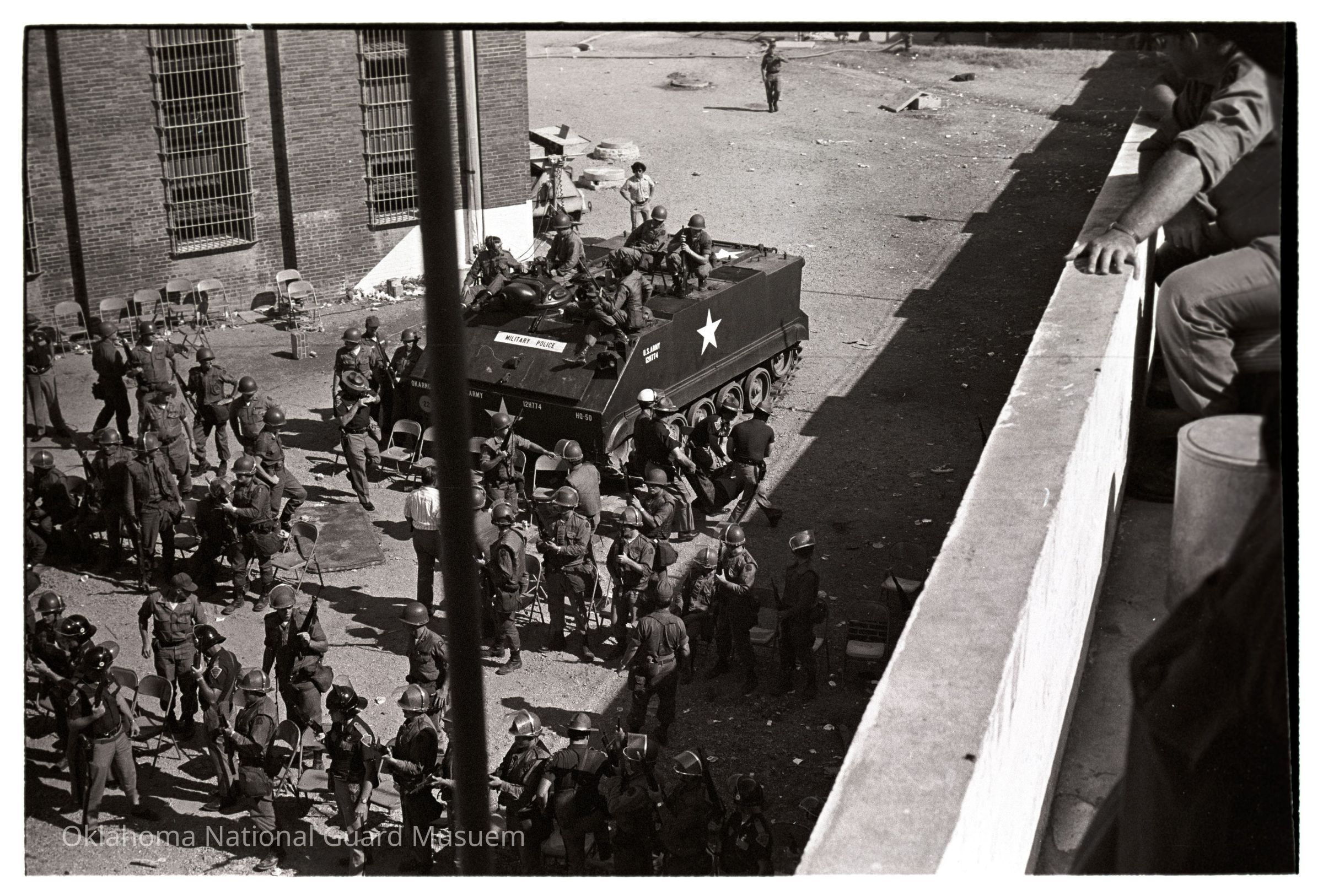 Soldiers in riot gear and an M113 during the McAlester Prision Riot