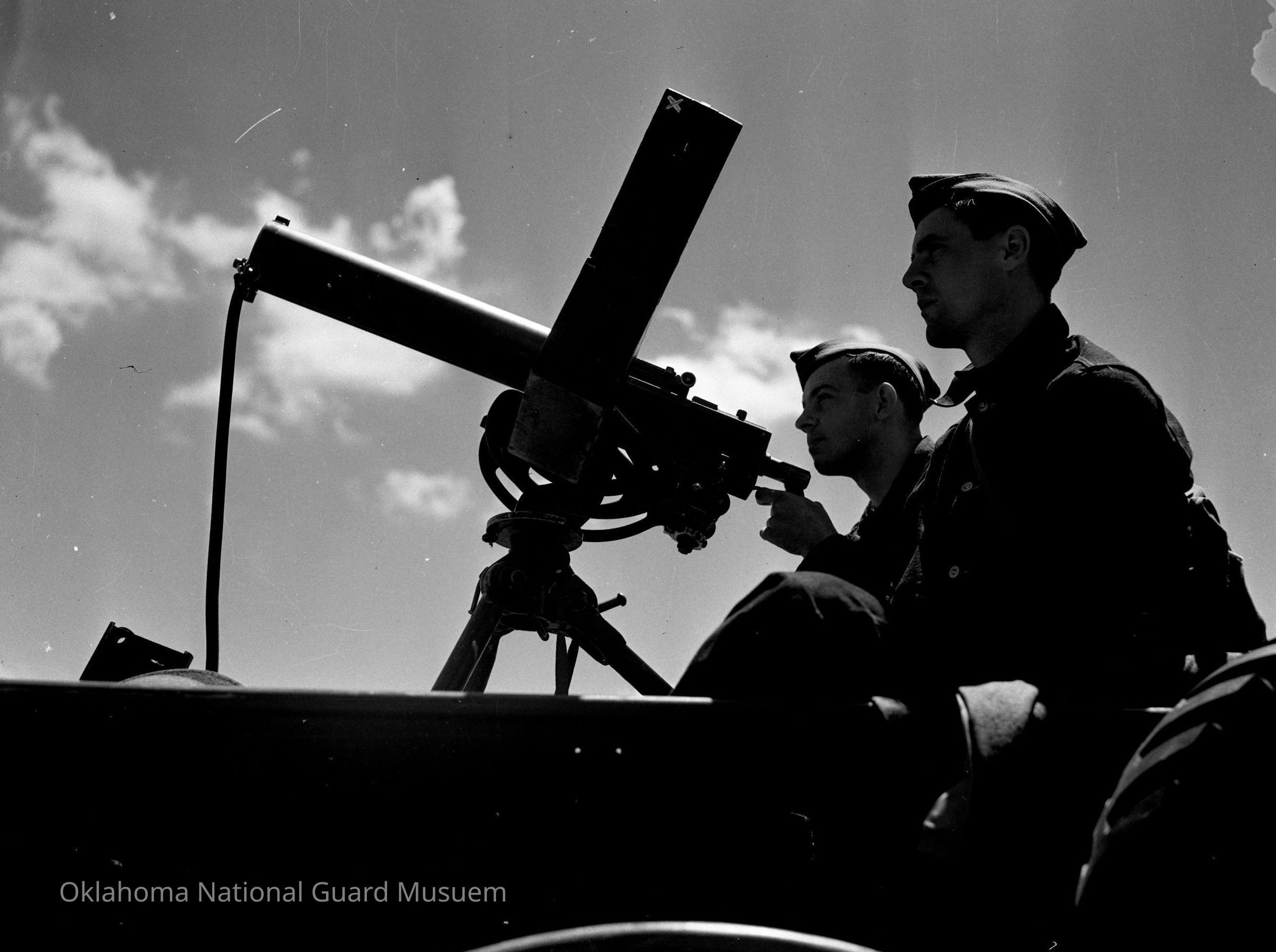Negative of soldiers in truck with machine gun