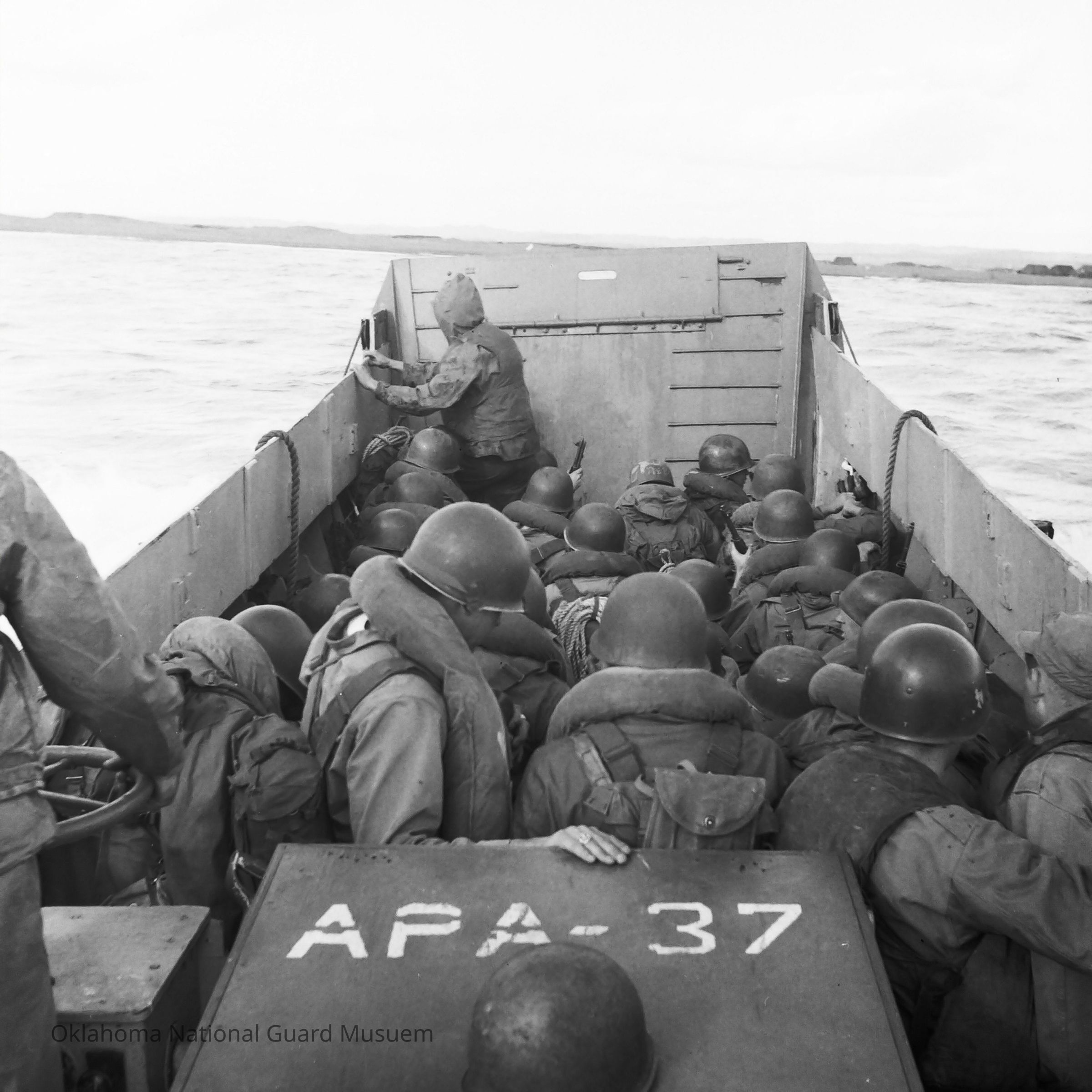 Negative of soldiers landing on beach from landing craft