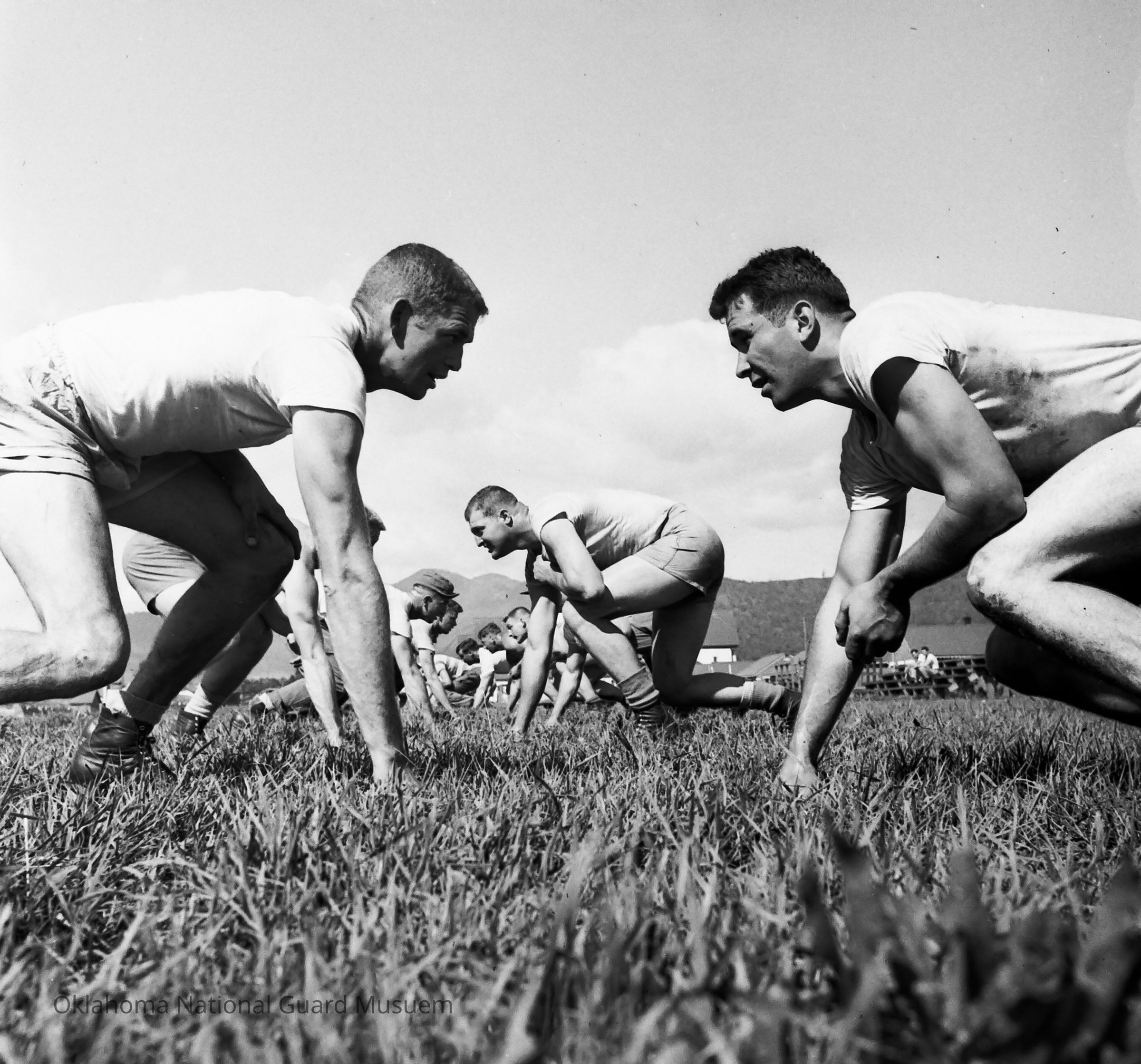 Negative of soldiers lined up during football practice