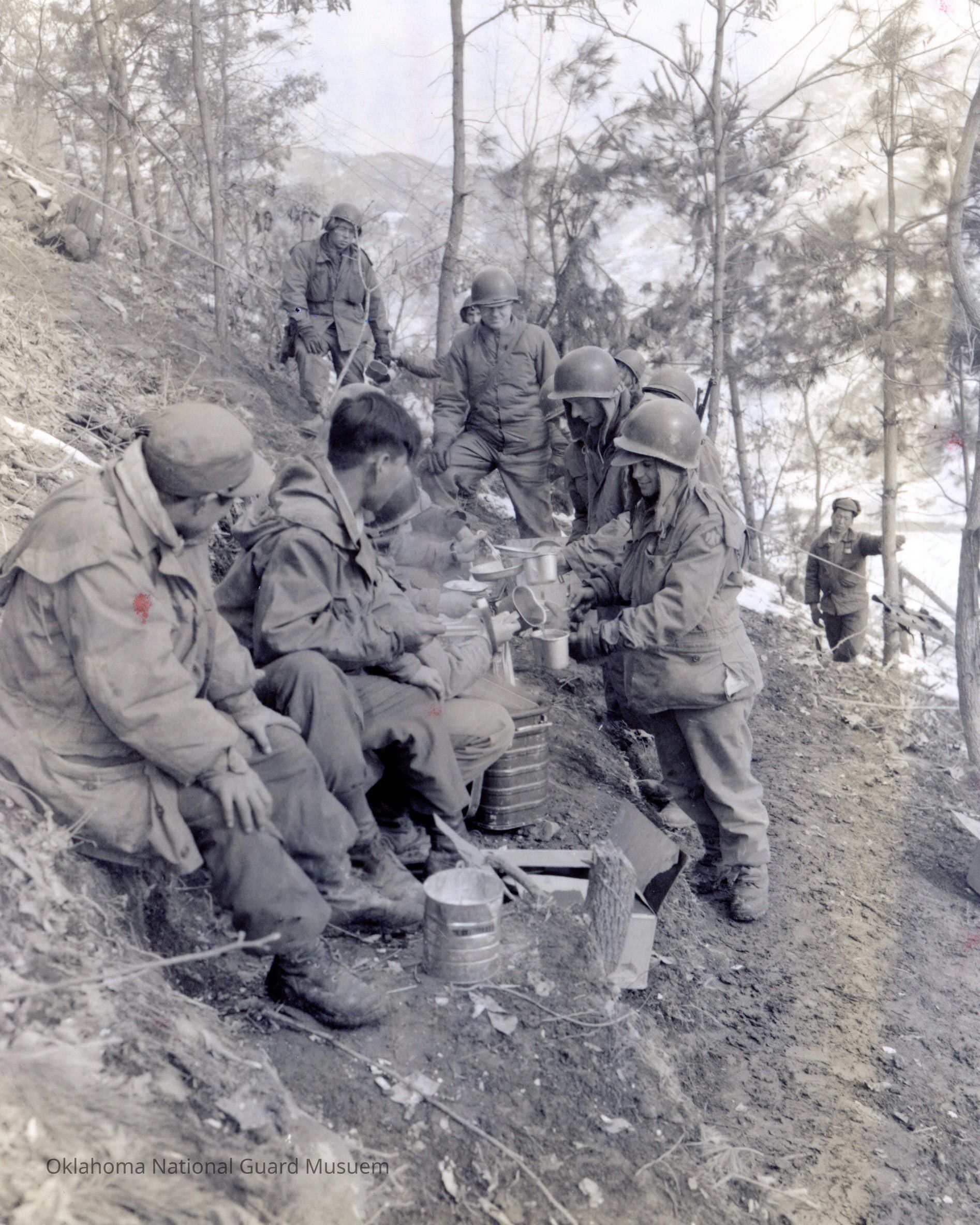 (Left to Right) William F. Poirier (Hazel Park, Michigan), Eugene Weirauch (Chicago, Illinois), and Bill C. Robertson (Frederick, Oklahoma) line up for a hot meal. Company F 2nd Battalion 179th InfantryPhotograph Details