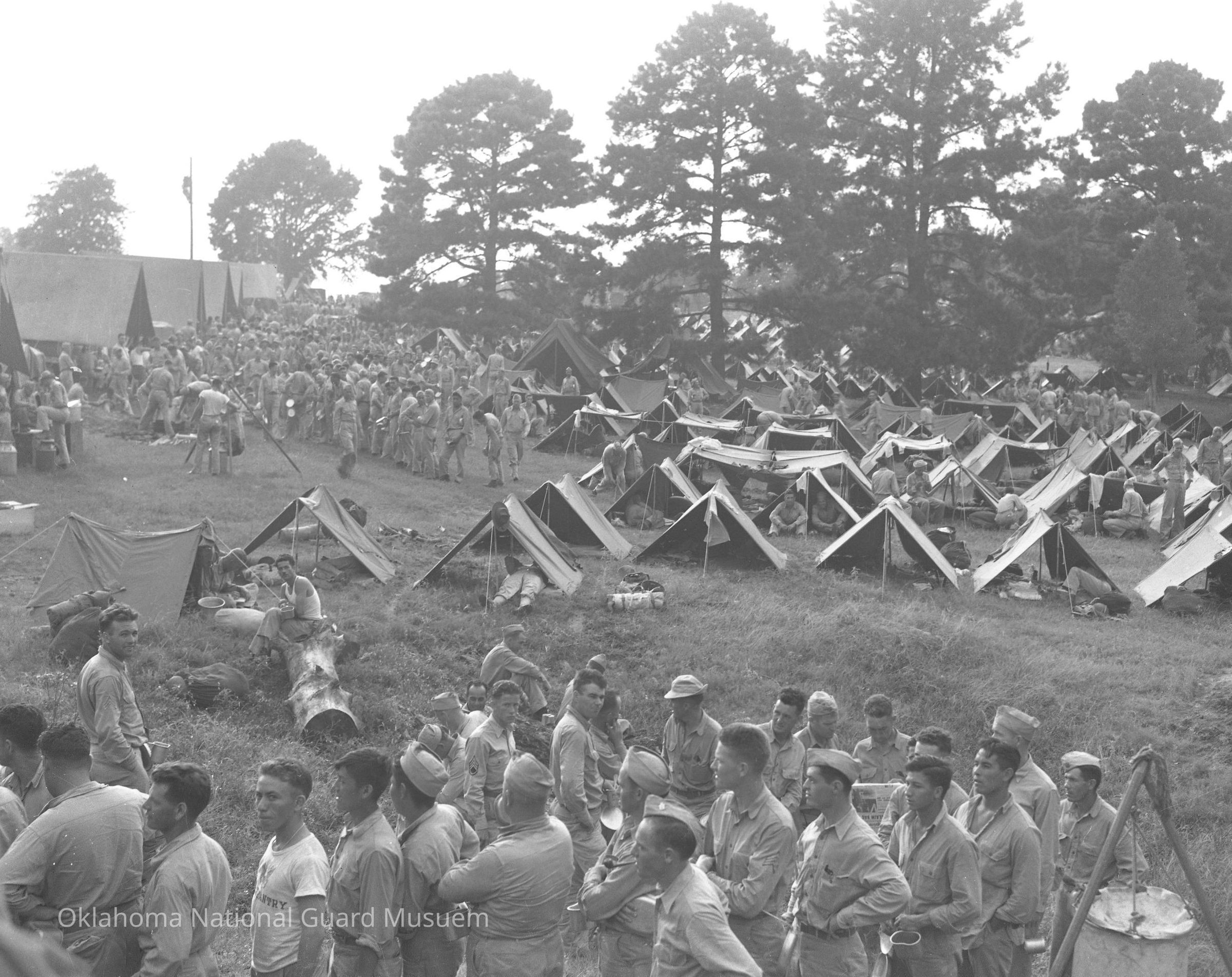 Soldiers lining up for mess call in a pup tent encampment