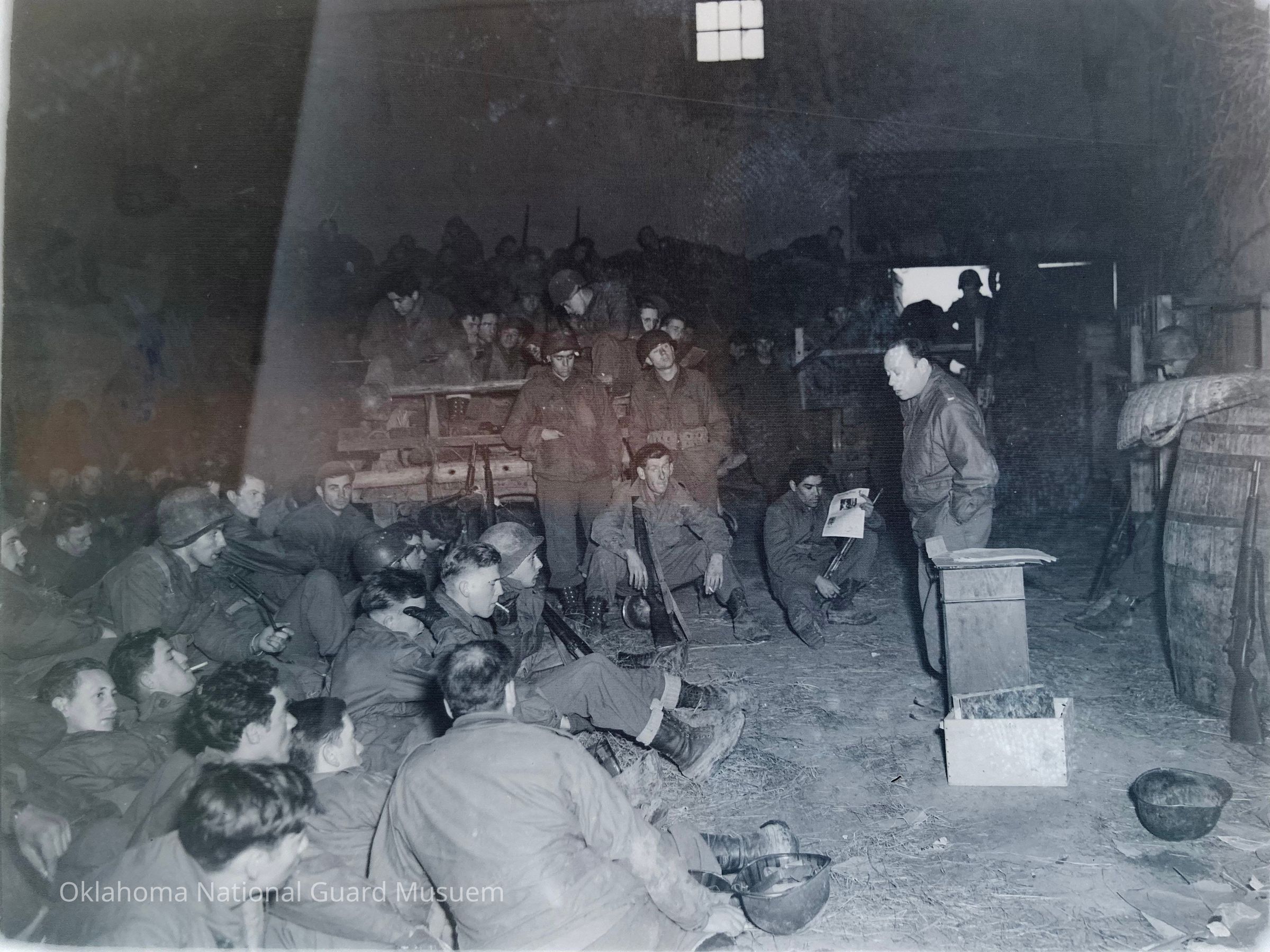 Negative soldiers of the 179th Infantry listening to a lecture on how American propaganda is shortening the war