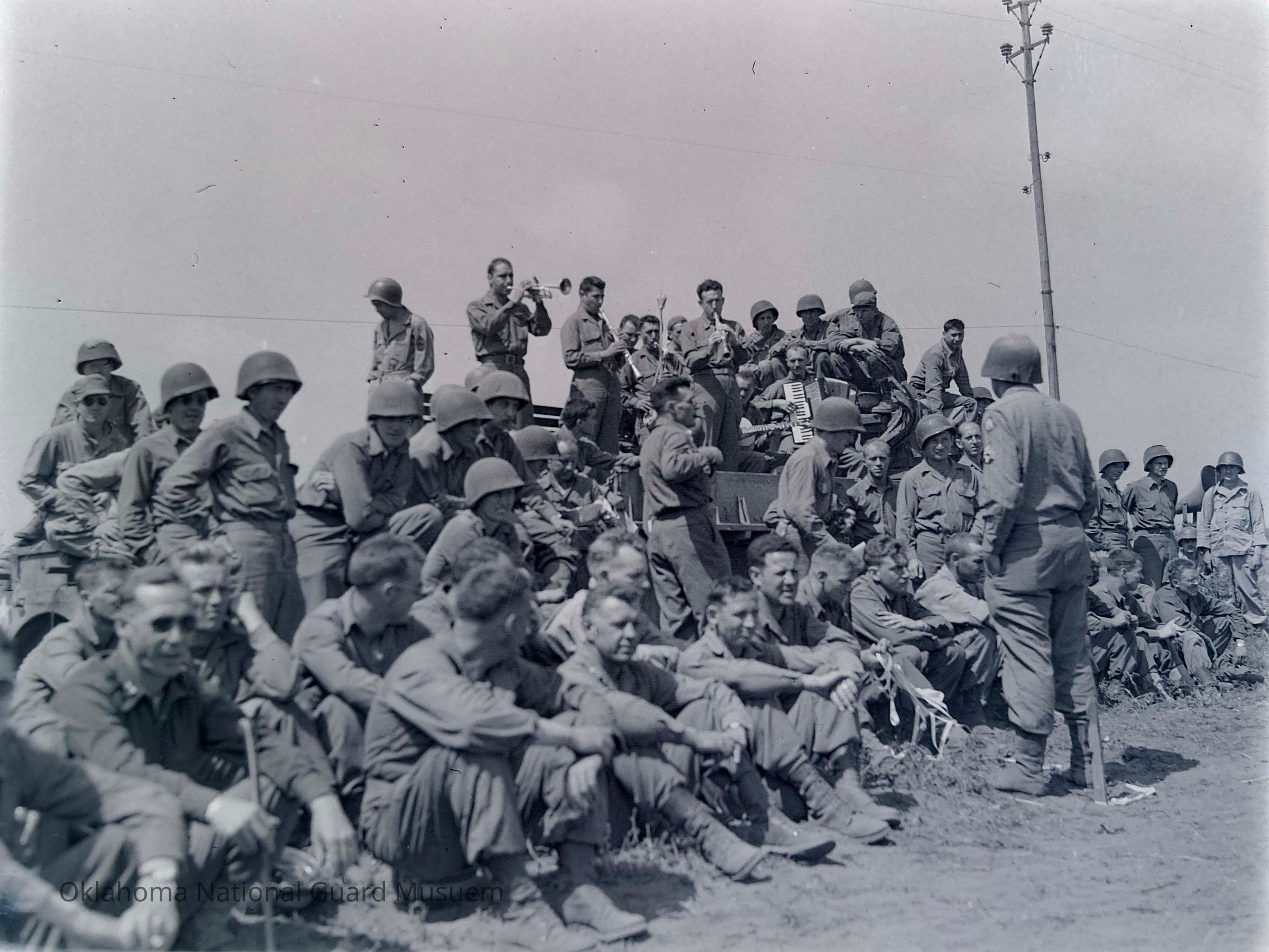 Negative of soldiers listening to band