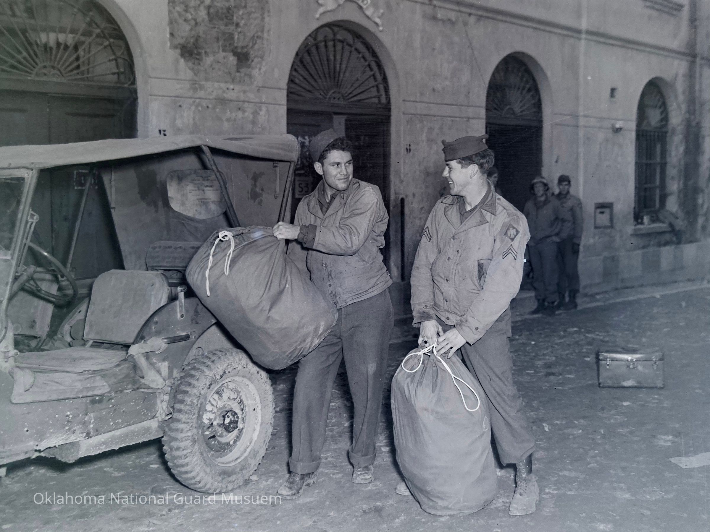 Photograph published in the 45th Division News, 29 January 1944, Vol.4, No. 29, Caption "They're off o the road to Algiers, these Thunderbirds to represent the Fifth Army in the coming Inter-Allied bouts to be held there sometime next month. Tossing his bag into the peep is Pvt. Cecil "Buddy" Shumway, Fifth Army amateur heavyweight champ. On the right, Cpl. Jim Palmer, lightweight champ, stands ready to load his belongings."Made/Created