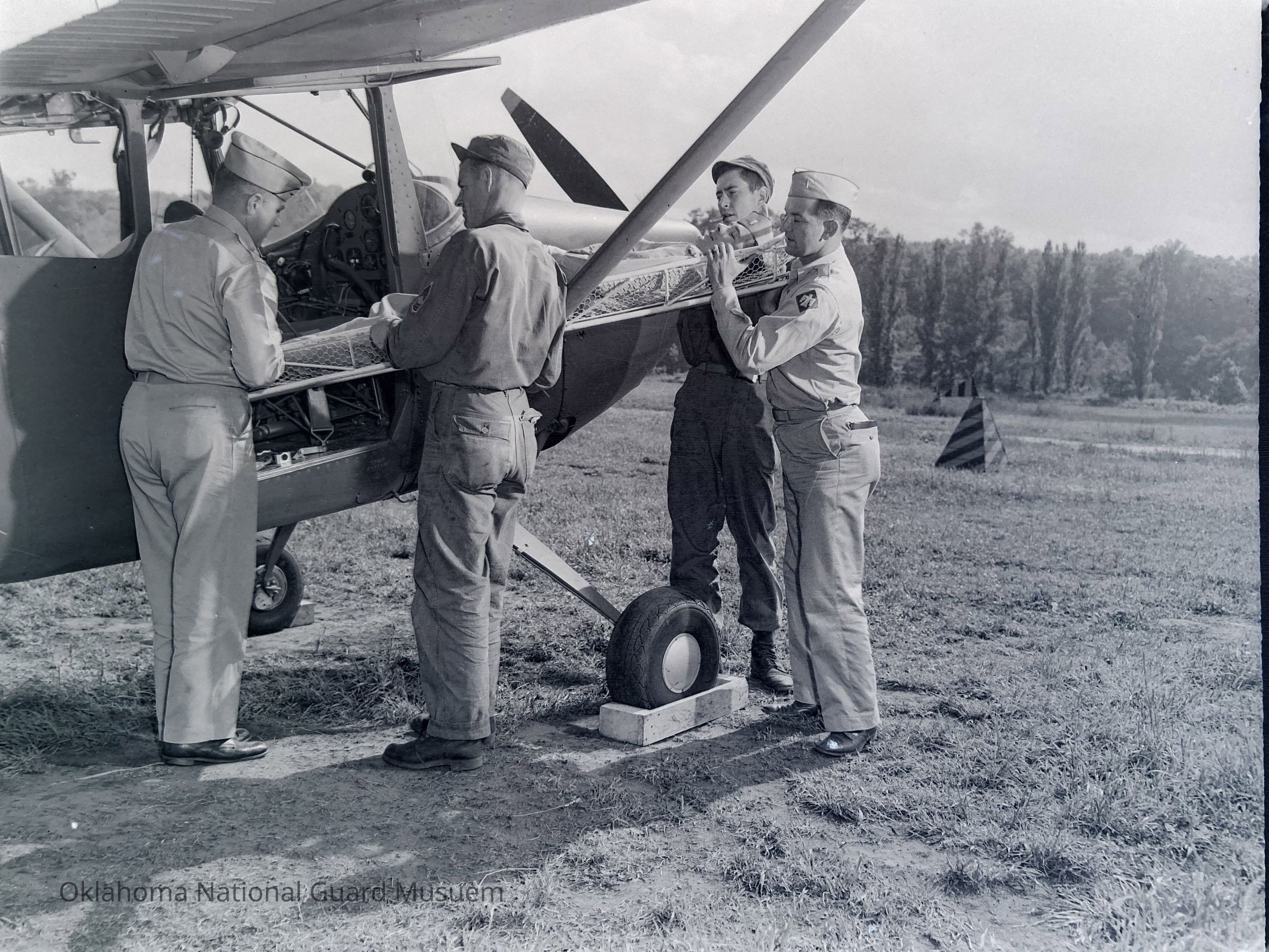 Soldiers loading a man on stretcher into a light observation aircraft