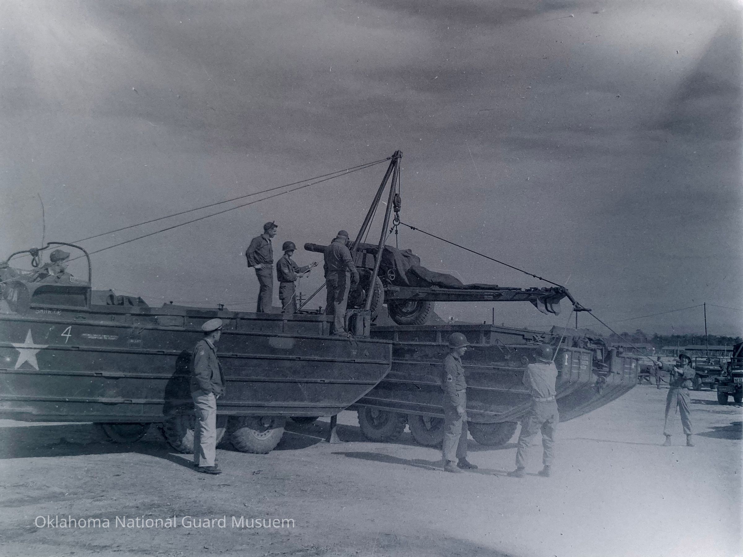 Negative of soldiers loading artillery into DUKW on Hokkaido, Japan