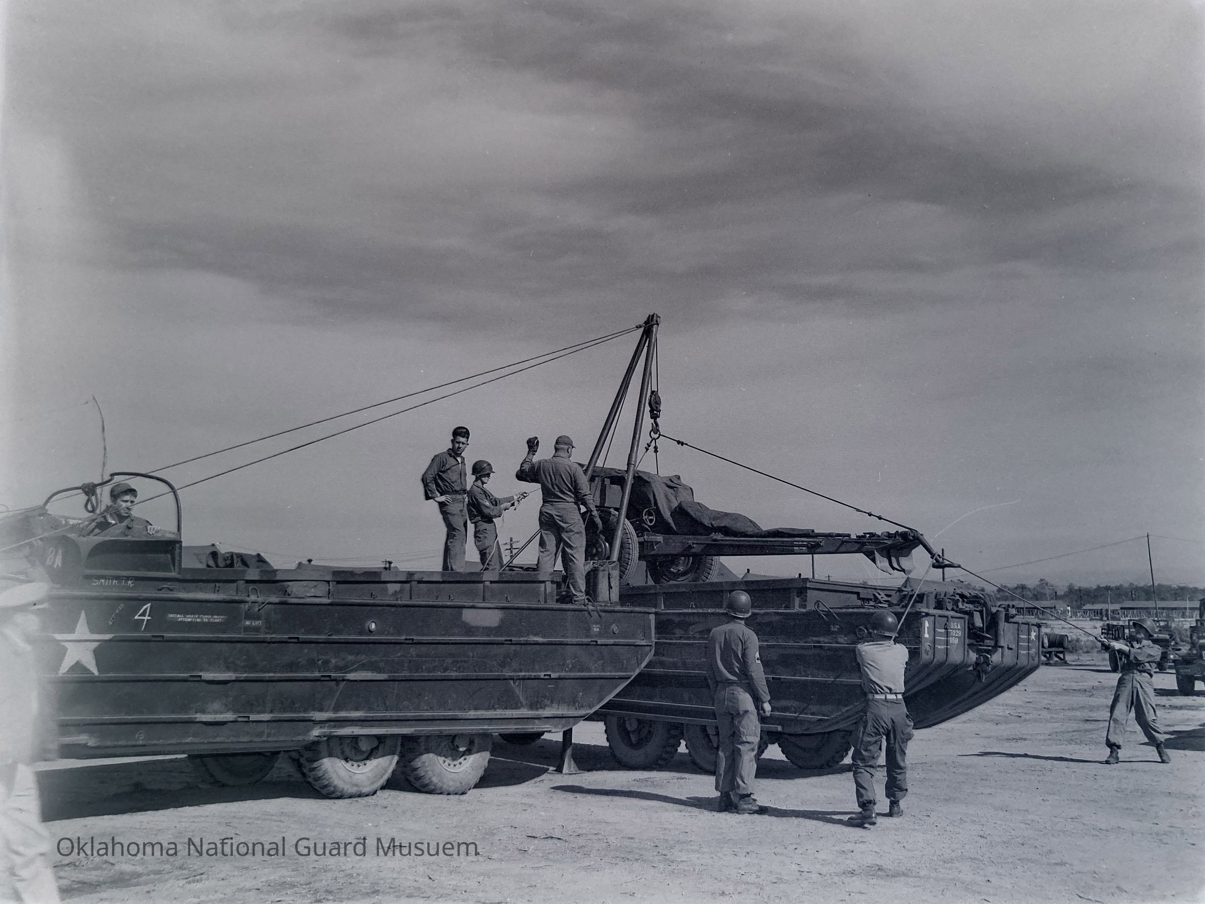 Negative of soldiers loading artillery into DUKW on Hokkaido, Japan