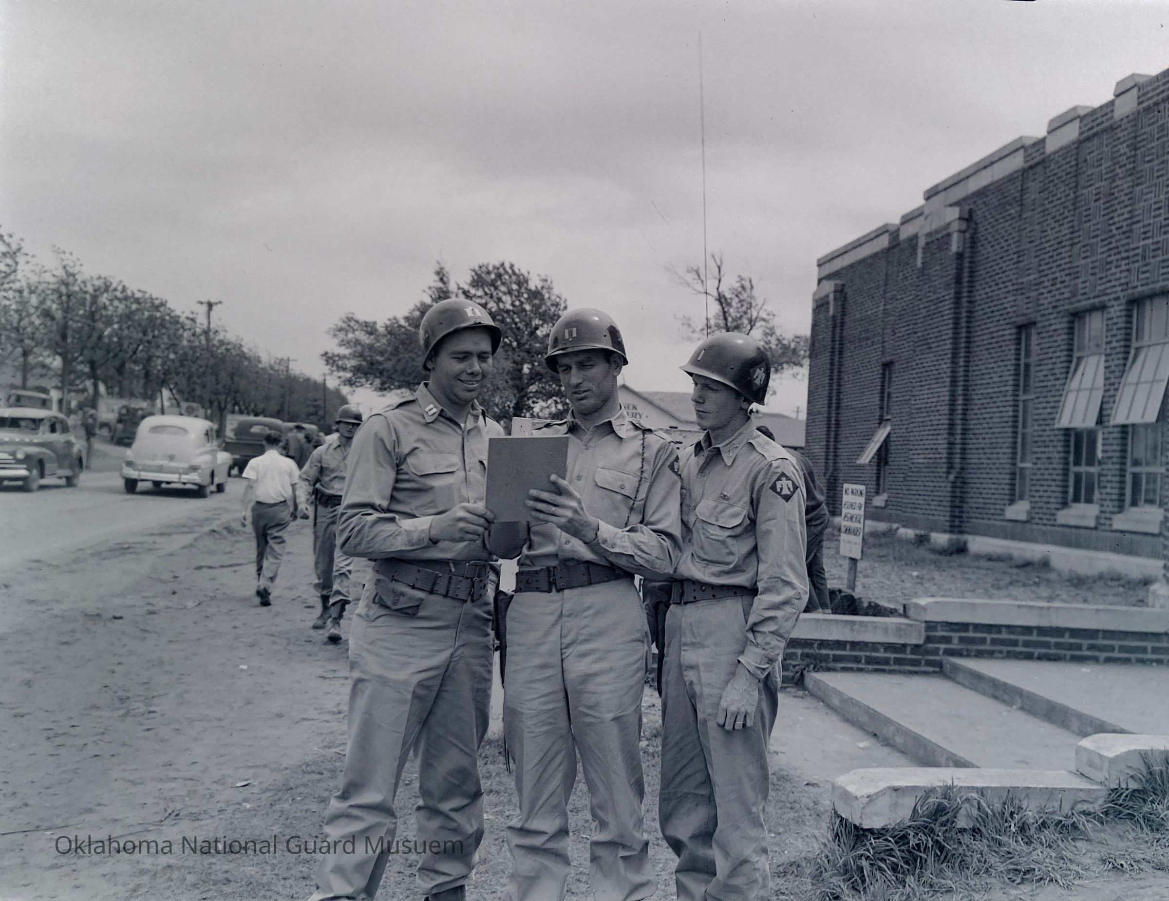 Negative of soldiers looking at a clipboard. Disaster response after the Holdenville tornado.