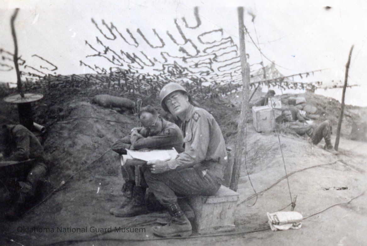 Russell Funk, 158th Field Artillery Commander, sits on a wooden crate while looking over maps
