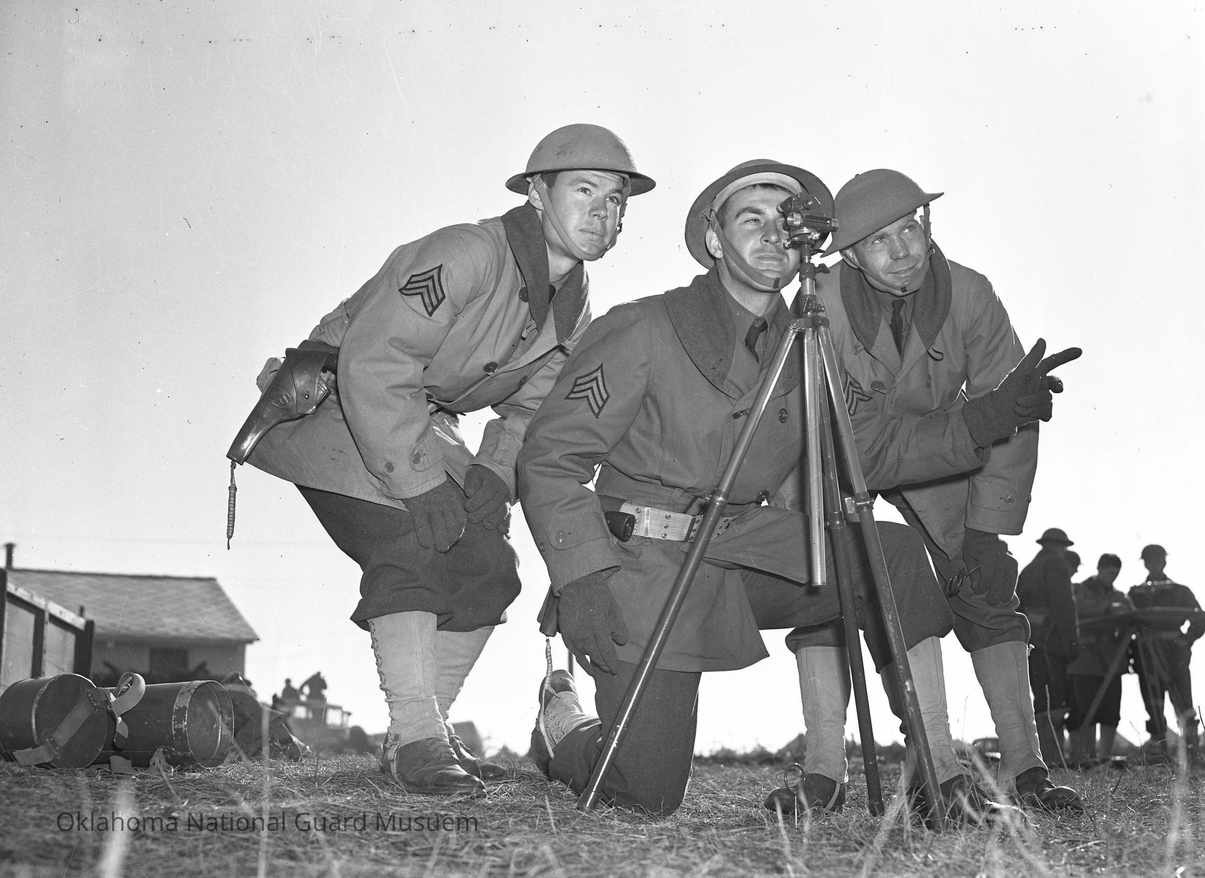 Negative of soldiers looking through spotting scope