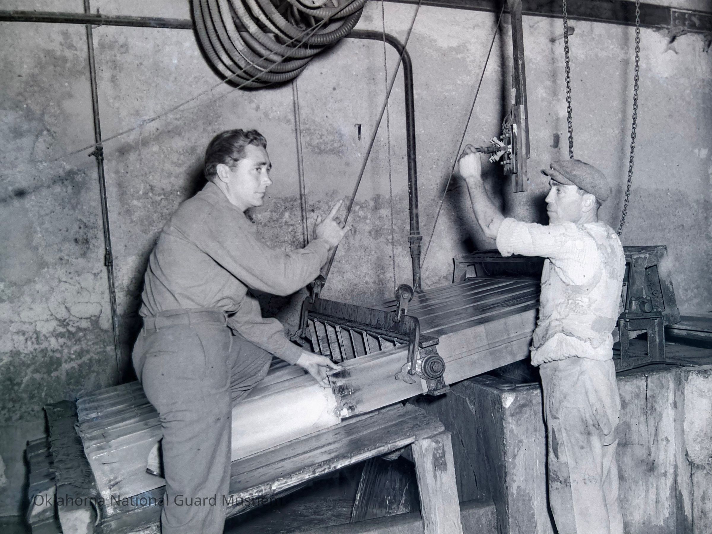 Photograph published in the 45th Division News, 22 July 1944, Vol. V, No. 2, Caption "This Italian ice plant was buy gathers cobwebs until an alert MP spotted it, and thee G-4 started supply GI materials. Now it's up on a 24 hour basis, turning out six or seven thousand pounds of ice a day for the division units with Pvt. Boyd Traywick, Oklahoma City, in the role as Thunderbird iceman."Made/Created